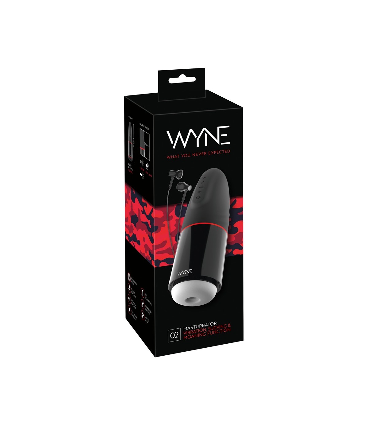 WYNE 02 Masturbateur 4 moteurs qui dorlote intensément le pénis avec 10 modes de vibration et 3 modes d'aspiration. De plus, des gémissements sexy (3 sons) à travers les écouteurs attachés vous mettront dans l'ambiance. Toutes les fonctions peuvent être contrôlées séparément ou en combinaison d'une simple pression sur un bouton directement sur le jouet pratique.