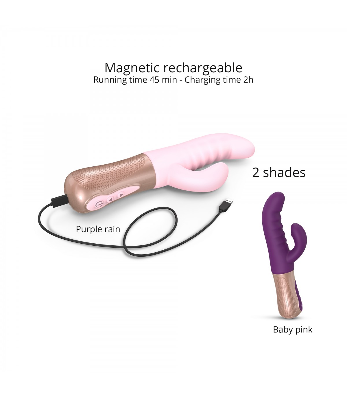 - Design texturé pour des sensations intensifiées : embouts en silicone pour la zone clitoridienne, ondulations et tige incurvée pour la zone du point G