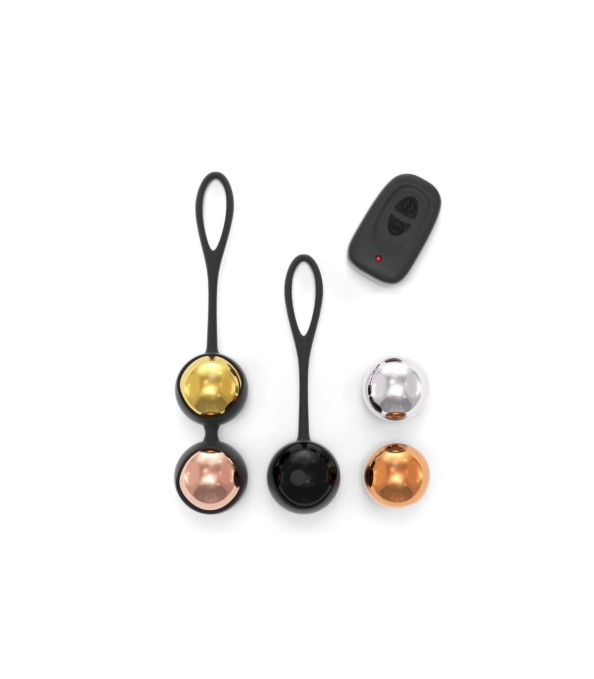 Système d'entraînement de balles chinoises avec différents poids. Il intègre une boule vibrante rechargeable pilotée depuis sa télécommande pour mieux réaliser les exercices de Kegel.