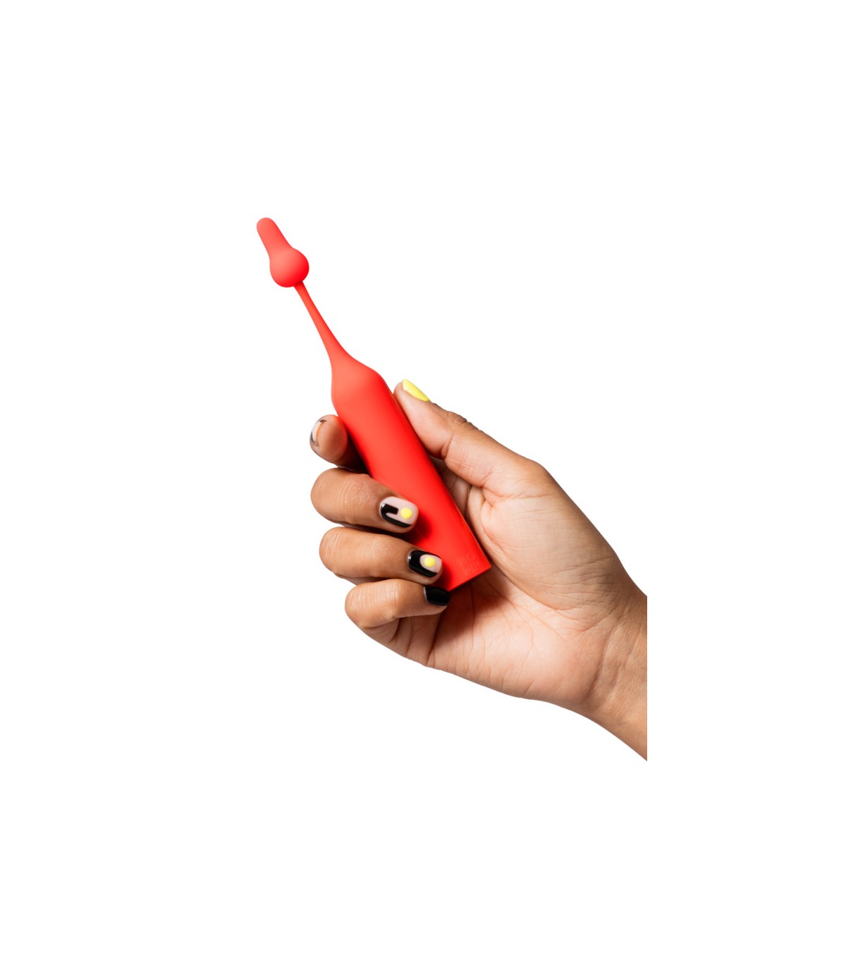 - Vibromasseur à pointe ronde : la pointe arrondie dorlote le clitoris, les mamelons ou les testicules avec une stimulation ciblée à haute fréquence.