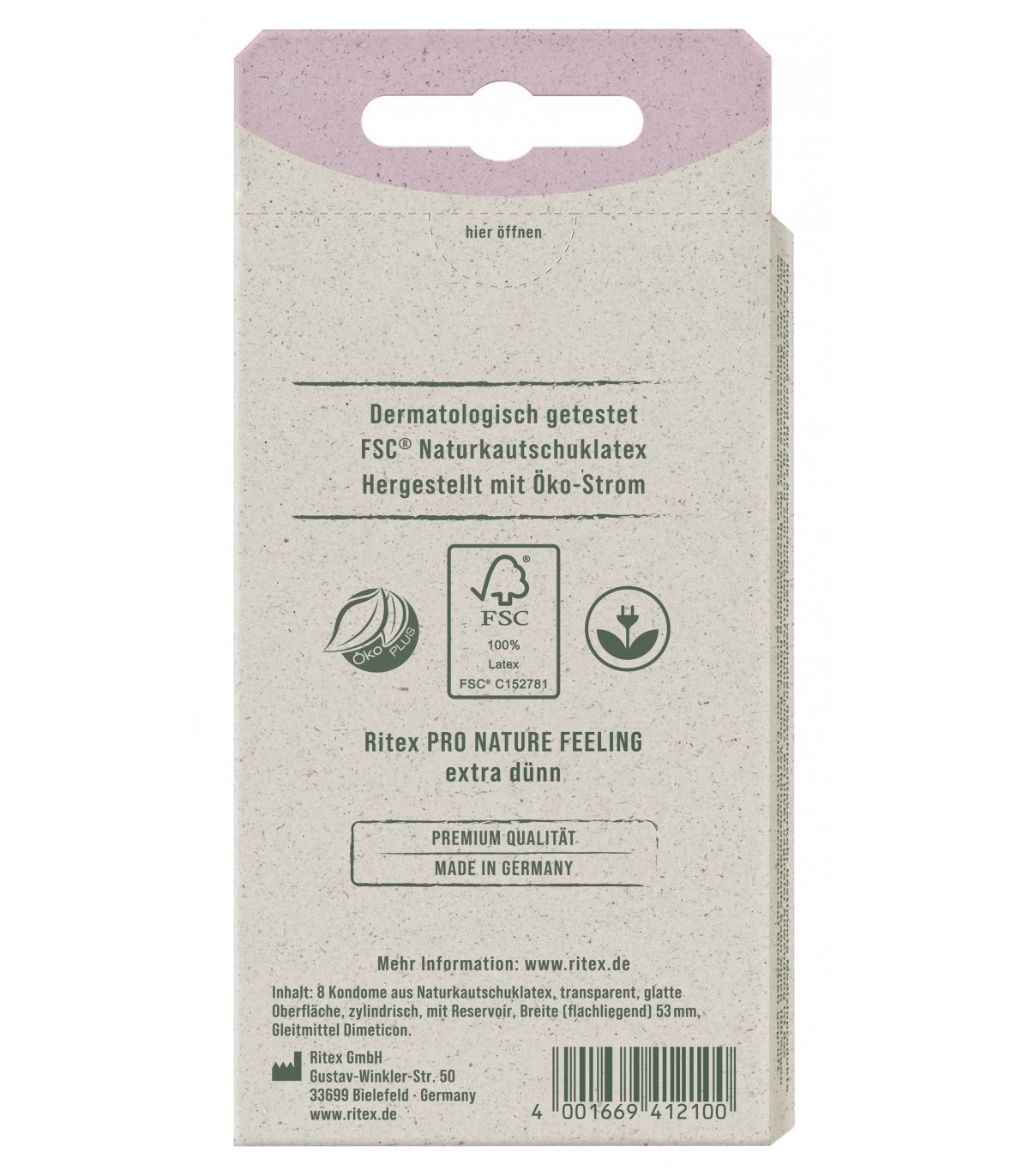 Rapprochez-vous de la nature la plus naturelle au monde. Confiez-vous à vos sensations avec les nouveaux préservatifs Ritex PRO FEELING. Fabriqués à partir de latex de caoutchouc naturel issu de cultures écologiquement durables et d'électricité verte, conformément à la norme EKOénergie. Ils bénéficient également d'un emballage écologique et d'un soin tout particulier.