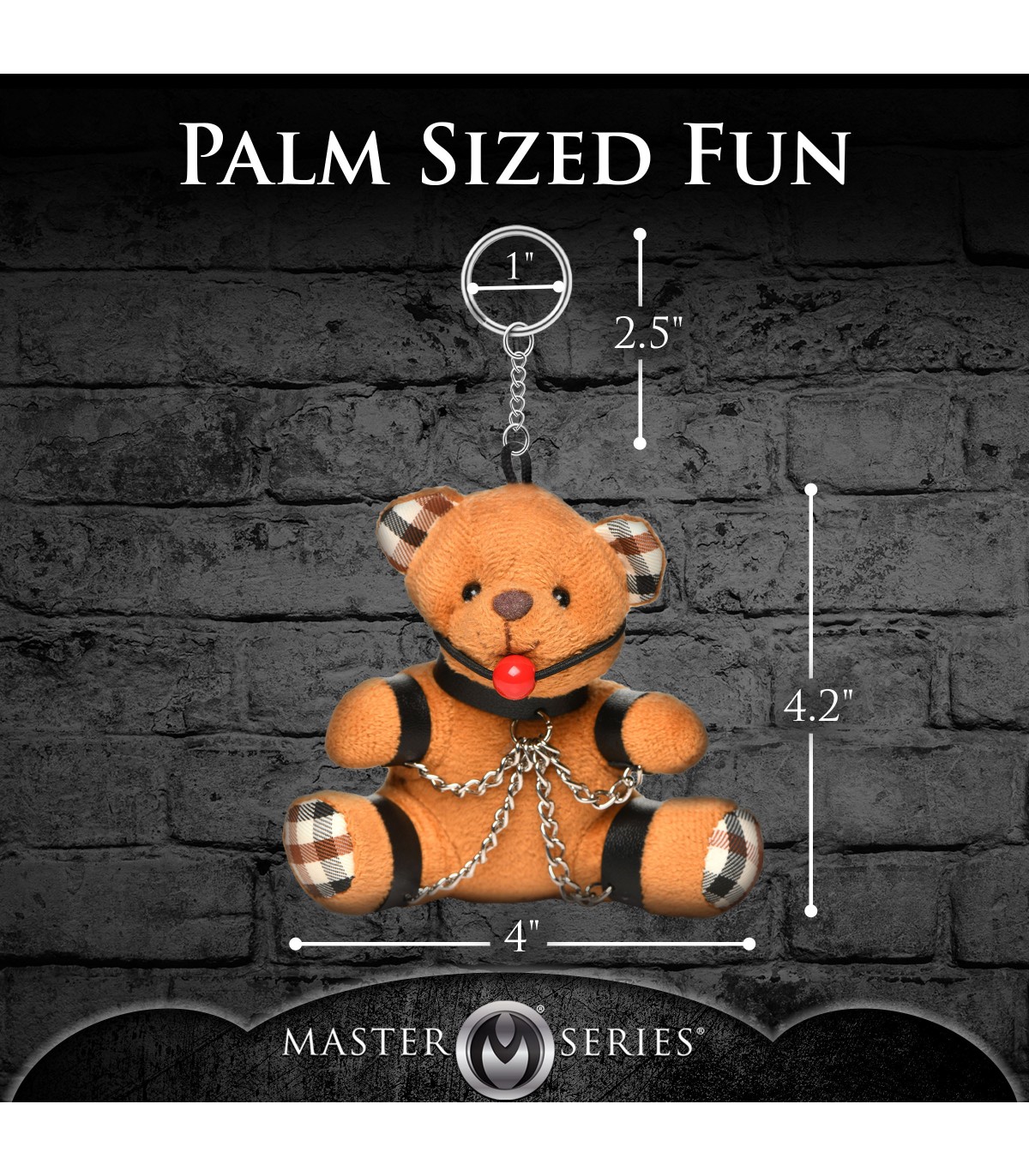 Give this gagged bear as a gag gift or keep it for yourself! The bondage bear fits in the palm of your hand and attaches to a keychain or bag as a fun way to signal that you're kinky! With a necklace, wrist and ankle cuffs and nickel-free chains connecting them, this bear is strapped in for your pleasure and fun! Made of polyester, synthetic leather, plastic and nickel-free metal.