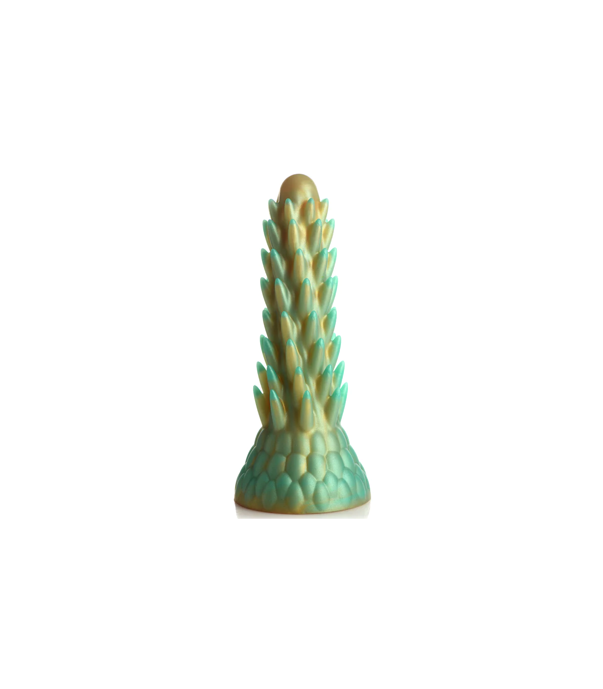 If you've ever found a stegosaurus's tail to be a turn-on, or loved hugging a tall, prickly cactus, this reptilian dildo is for you. It will treat you nicer than the aforementioned plant or creature, and will add incredible new sensations as you explore its textured rod. It has a beautiful gold and teal color throughout the entire shaft. It caps to a thinner round tip for easier insertion. The base is round and covered in scales, while the shaft itself has long, round spikes that point towards you as you impale yourself on this fantastically stimulating toy. Made from premium, flexible, phthalate-free silicone, this dong is body safe and best used only with water-based lubricants. Enjoy hands-free rides due to the strong suction cup base. Invite a partner over for some cosplay or fantasy roleplay and use your favorite harness to transform this dong into a strap-on. Afterwards, be sure to wash it with warm water and mild soap, then spray it with a toy cleaner and air dry. Keep out of direct sunlight and heat.