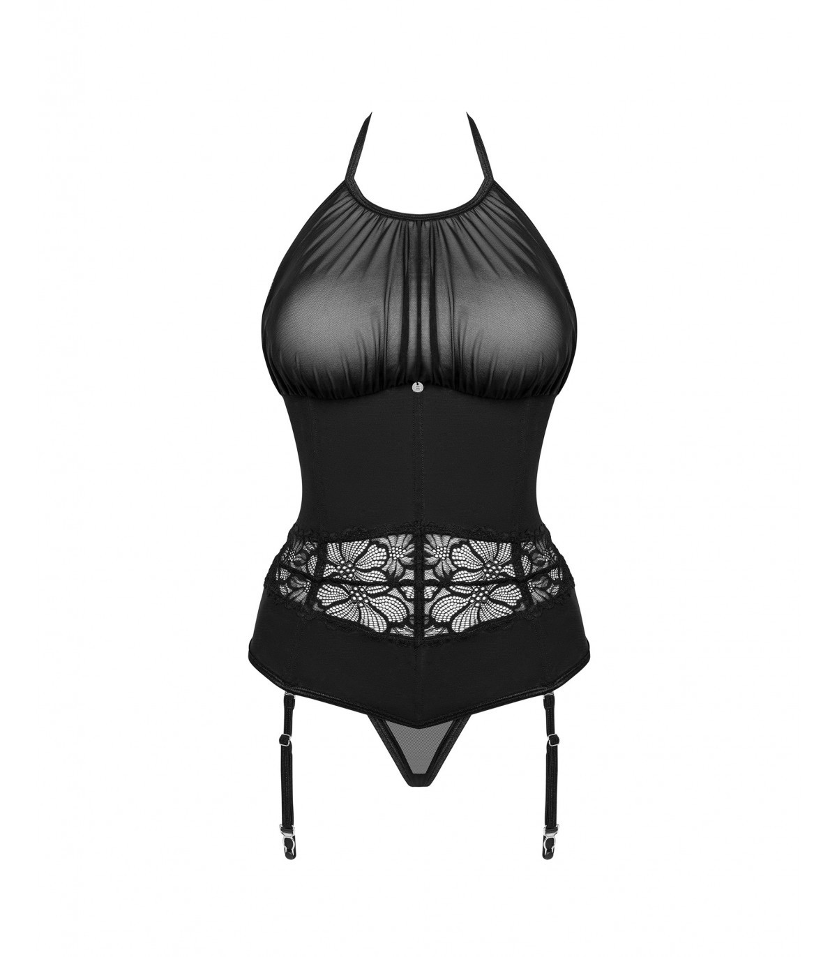 Do you fancy some lingerie that will warm up the atmosphere but you don't have anything in particular in mind? Do not care anymore! The Serafia corset was made to seduce. The unconventional combination of a slightly translucent fabric on the breasts with the intriguing floral lace that hugs the tummy and back makes a surprising impression. The black garter belts that can be removed whenever you want simply add spicy flavor. Feel free to experience the pleasure.