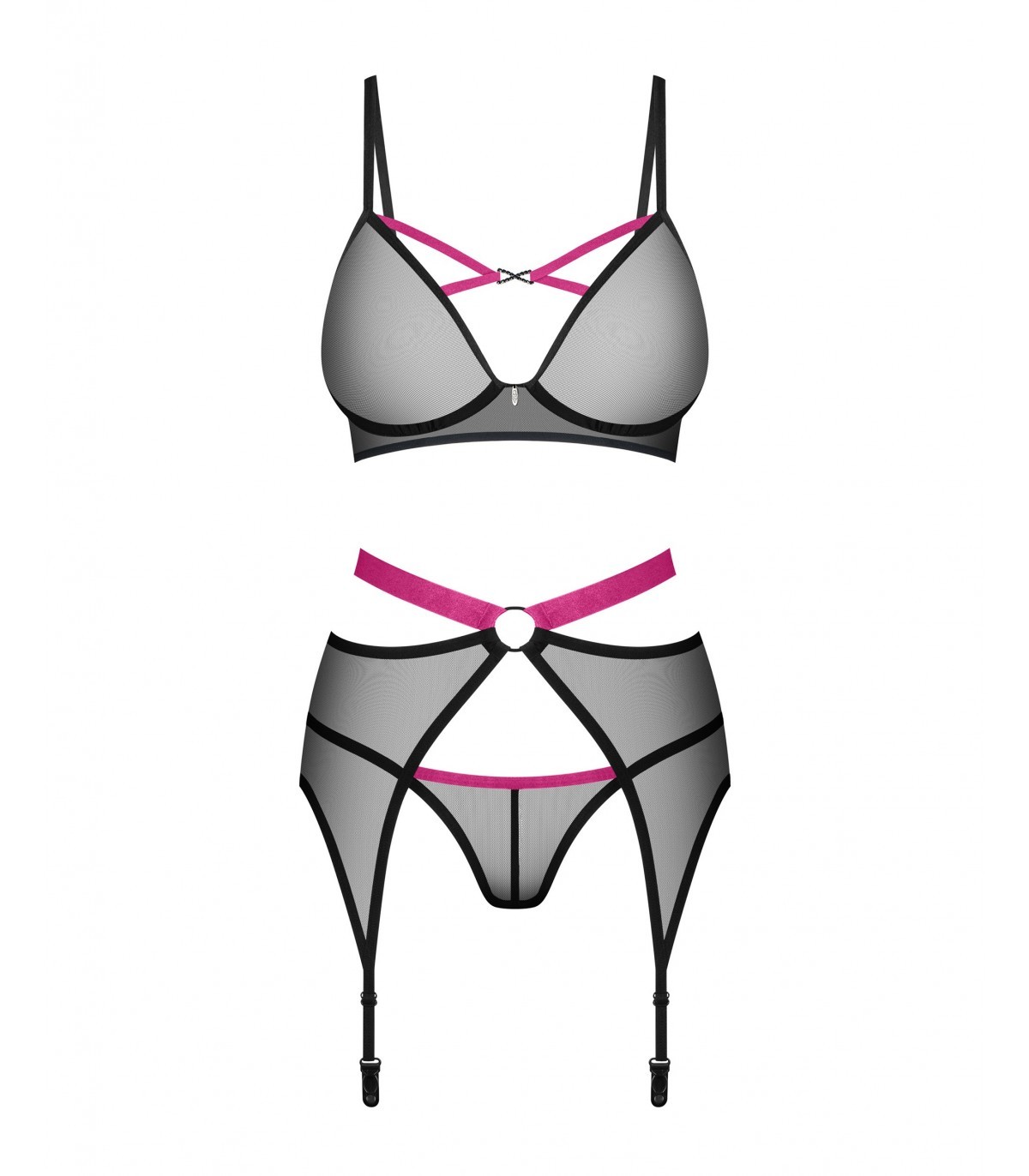 The three-piece set from the Novenes collection electrifies and impresses with its sensual design! It consists of a bra, thong and garter belt. Made from a sheer black fabric, embellished with purple accents and sparkly details. Its perfect fit guarantees an attractive appearance and comfort of use. See for yourself how powerful it can be!