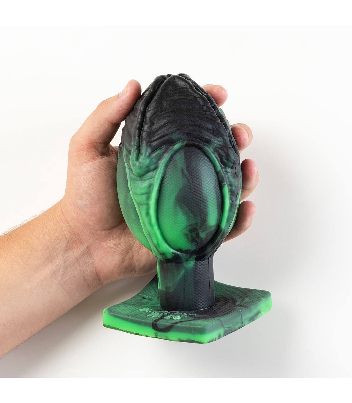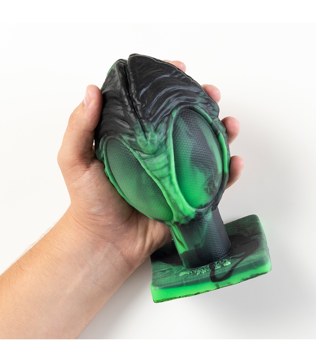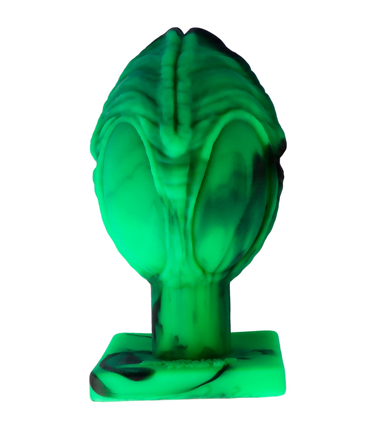 This dildo has a rounded shape with ridges along its length.