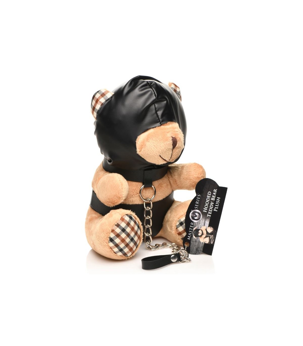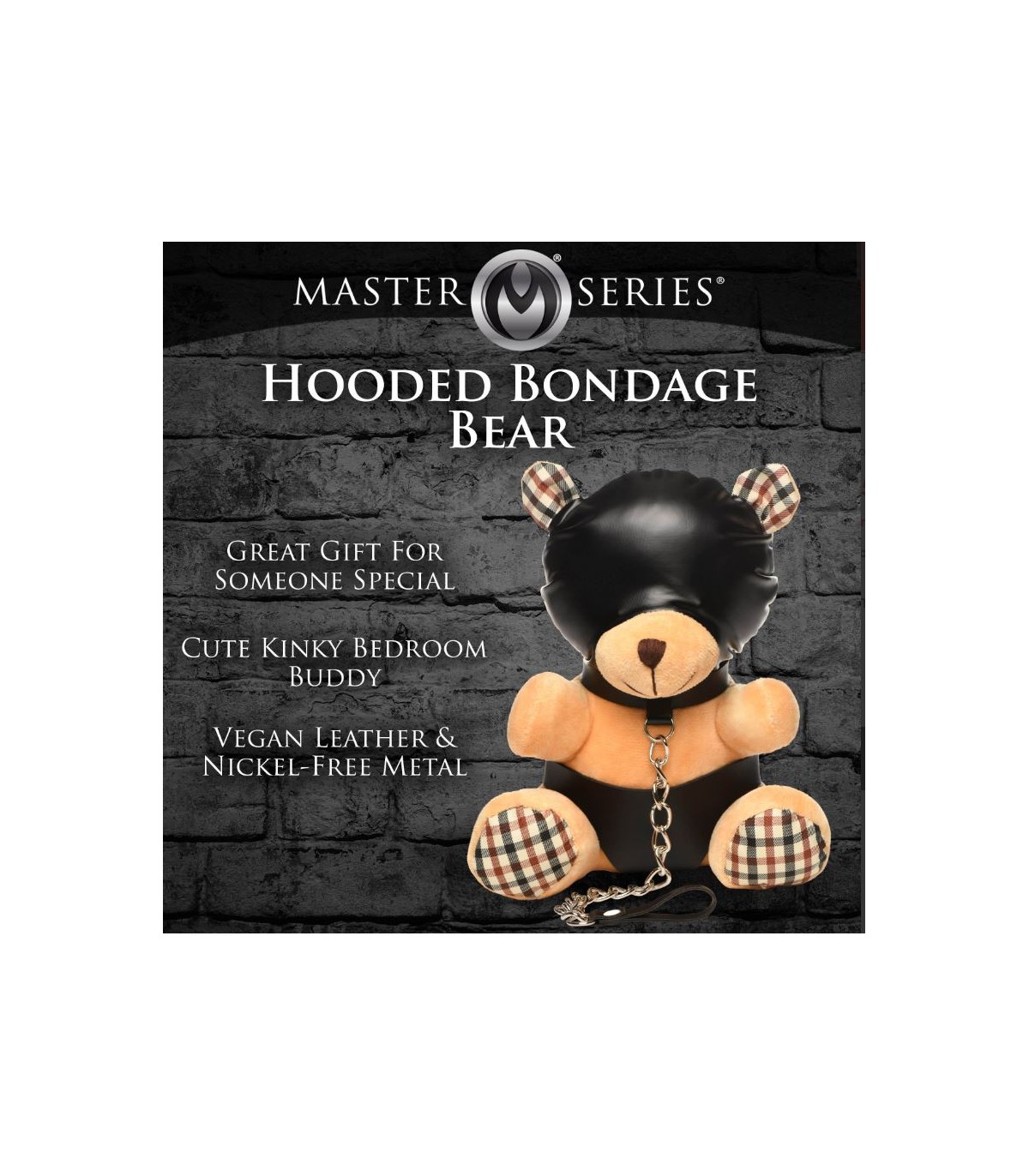 Buy it as a gift for yourself or others! It makes a great gag gift or in this case a gimp gift! It's big enough to hug but doesn't take up too much room! Add it to your collection for little ones to play with, give it to your submissive during aftercare, or keep it with your pillows! This little hooded gimp bear has light peach colored fur, is dressed in PU leather panties and a hood. Attached to his collar is a metal chain leash. What better way to show off your kinky side than with an adorable and harmless bondage bear? Made from polyester, PU synthetic leather, plastic, and nickel free metal.