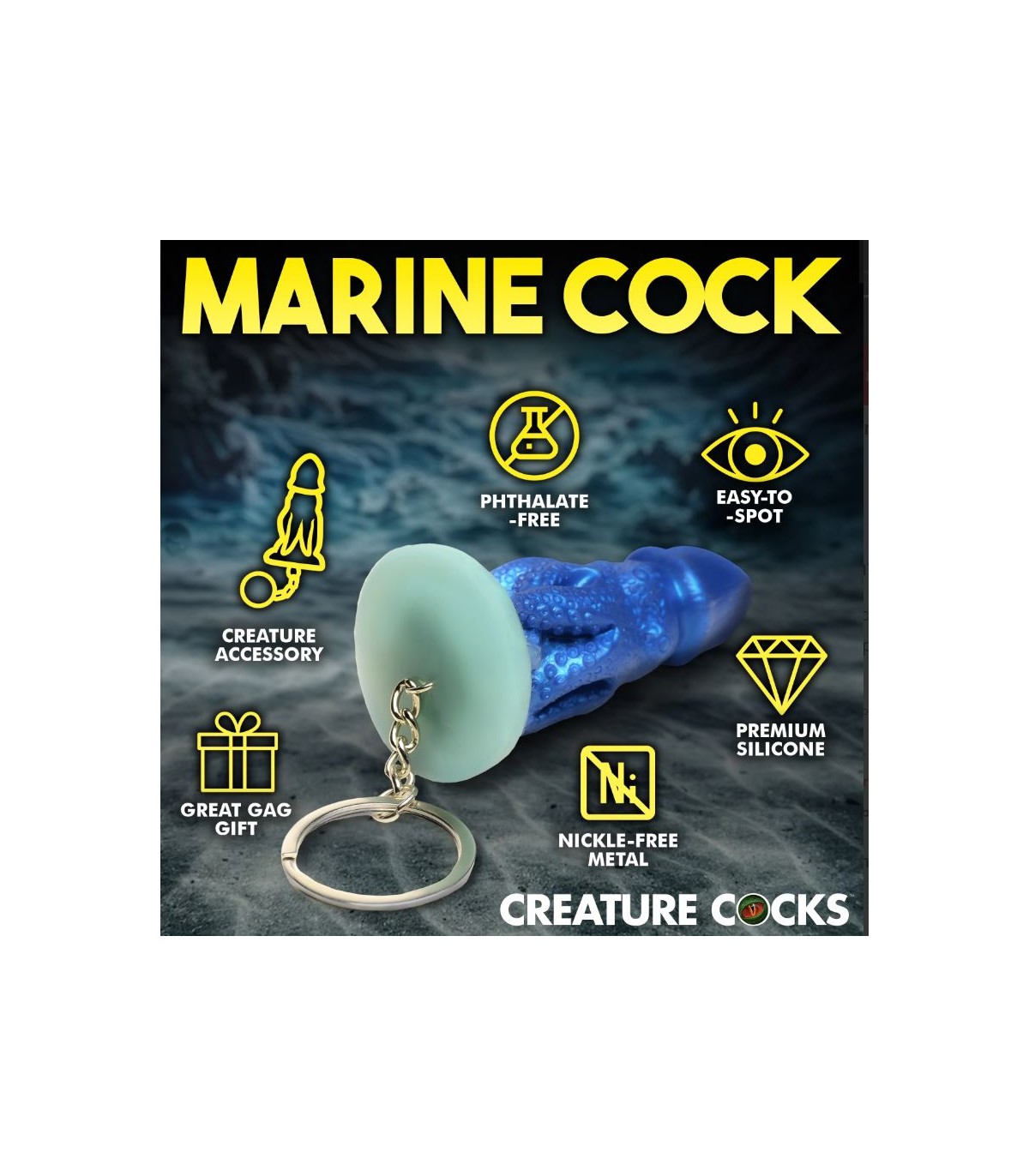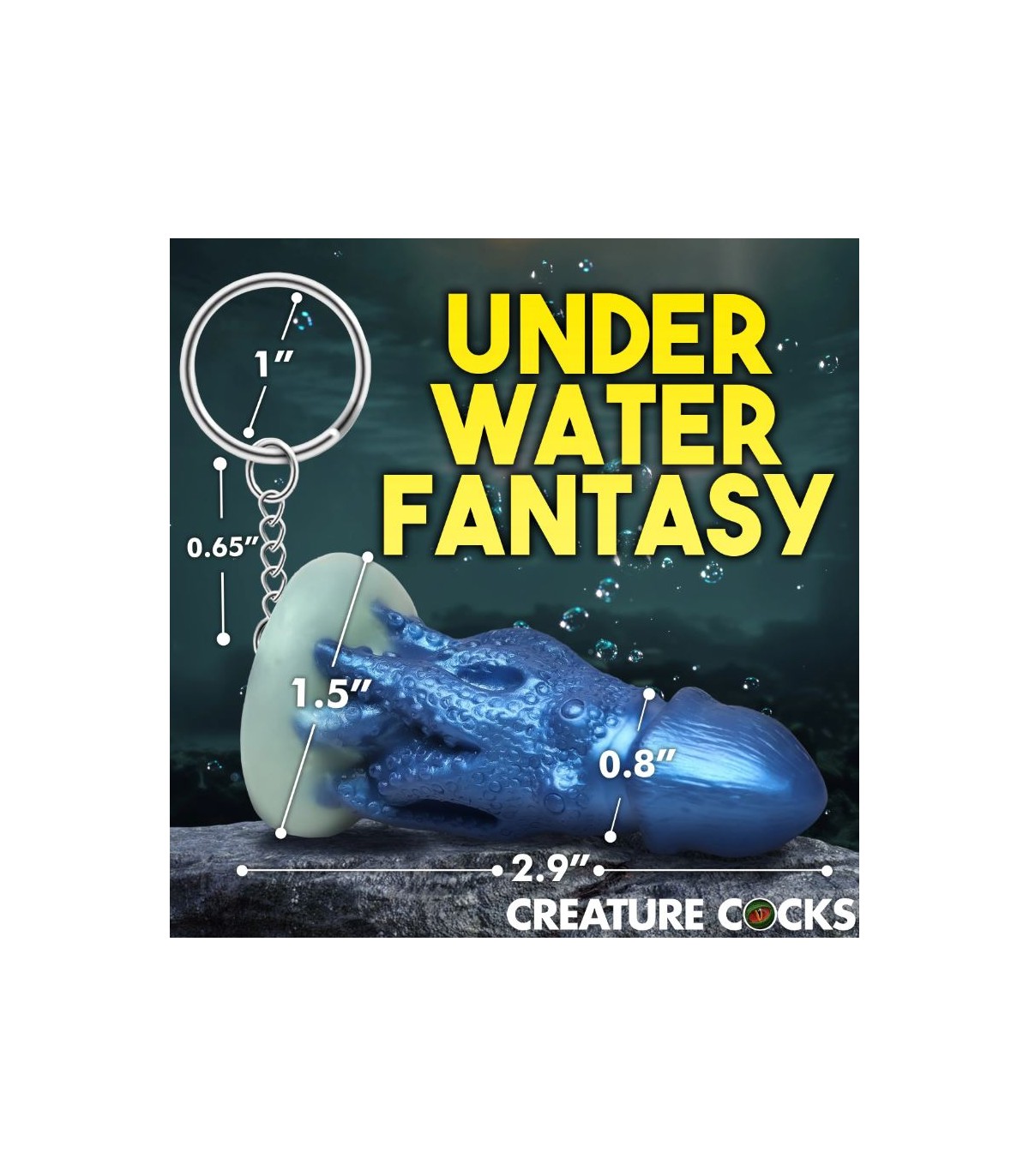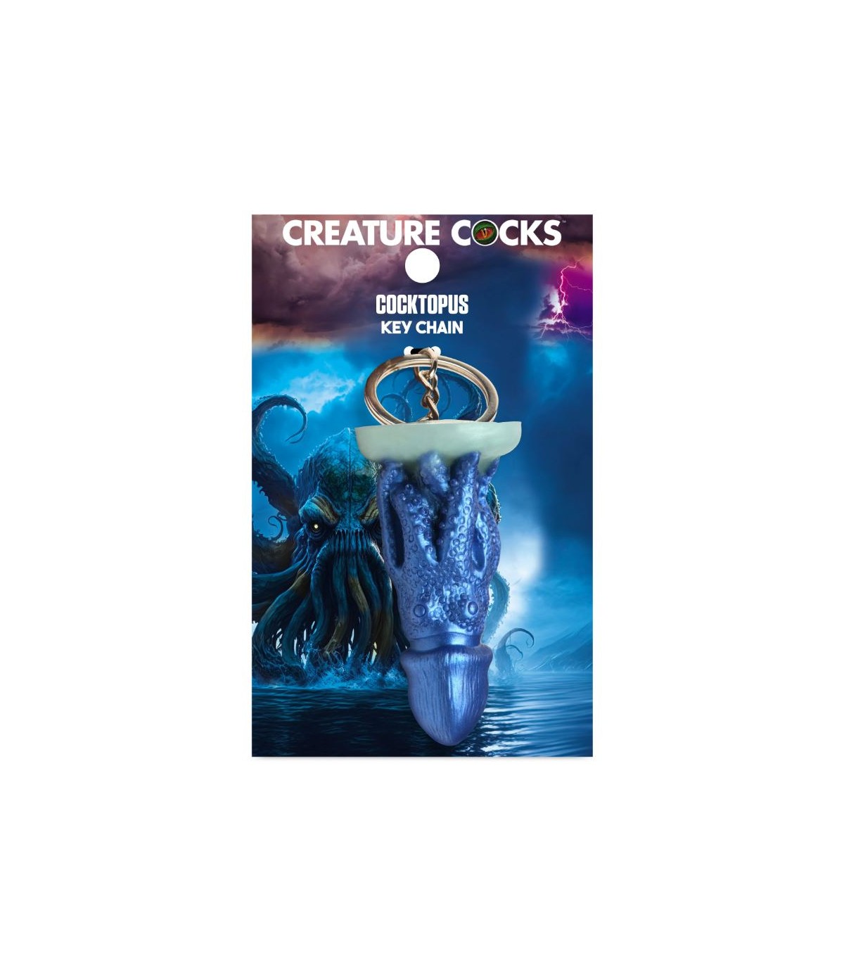 This burly, thick-headed octopus creature has shrunk down to travel with you wherever you go! Let your freak flag fly with these Creature Cocks Keychains! Show that you're into fantasy role-play, mythical sex, or hot horror monsters! Clip them to your keys, attach them to your phone case, clip them to a purse or wallet, or hang them from your rearview mirror to add some style and kinky fun! All of the little cocks are made from premium, phthalate-free, body-safe silicone and the metal is nickel-free for sensitive skin. Not for internal use. Novelty item only.