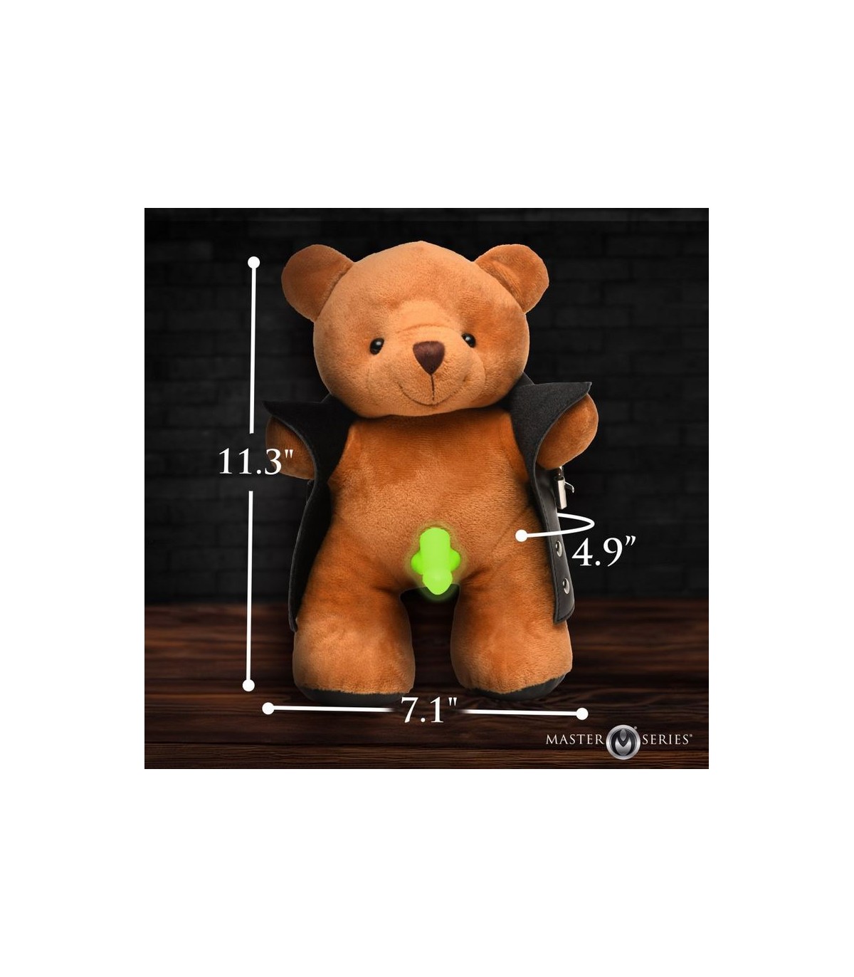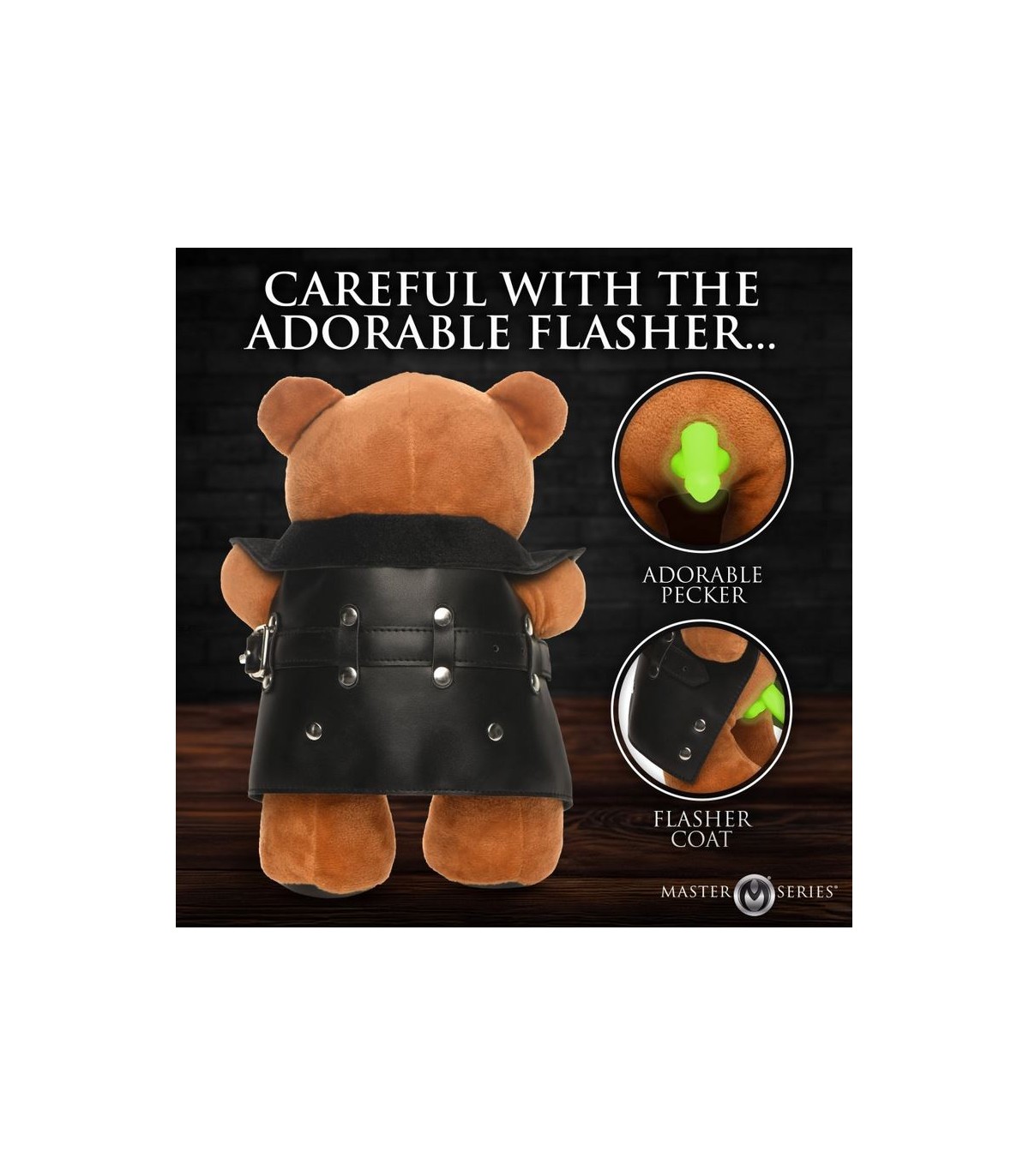 Amaze your friends both day and night with the Glow Show Exhibitionist Teddy Bear, a riotous addition to your collection of prank gifts! When they walk into a dark room, they only see the disembodied, glowing penis until they turn on the lights and see a cute bear showing them his genitals. Imagine the shocked faces of your friends, family, or teammates when they encounter this mischievous bear. This plush delight has soft brown fur, accented by a comically clear, glow-in-the-dark penis between his legs. He has a cheeky grin that is sure to elicit laughter. A vegan leather jacket that opens wide to reveal your fun surprise. As an added feature, the penis glows in the dark after being charged with light! Made from nickel-free metal components, it's a fun, harmless gift for all your prank needs. Enhance any occasion with a burst of unexpected laughter and charm.