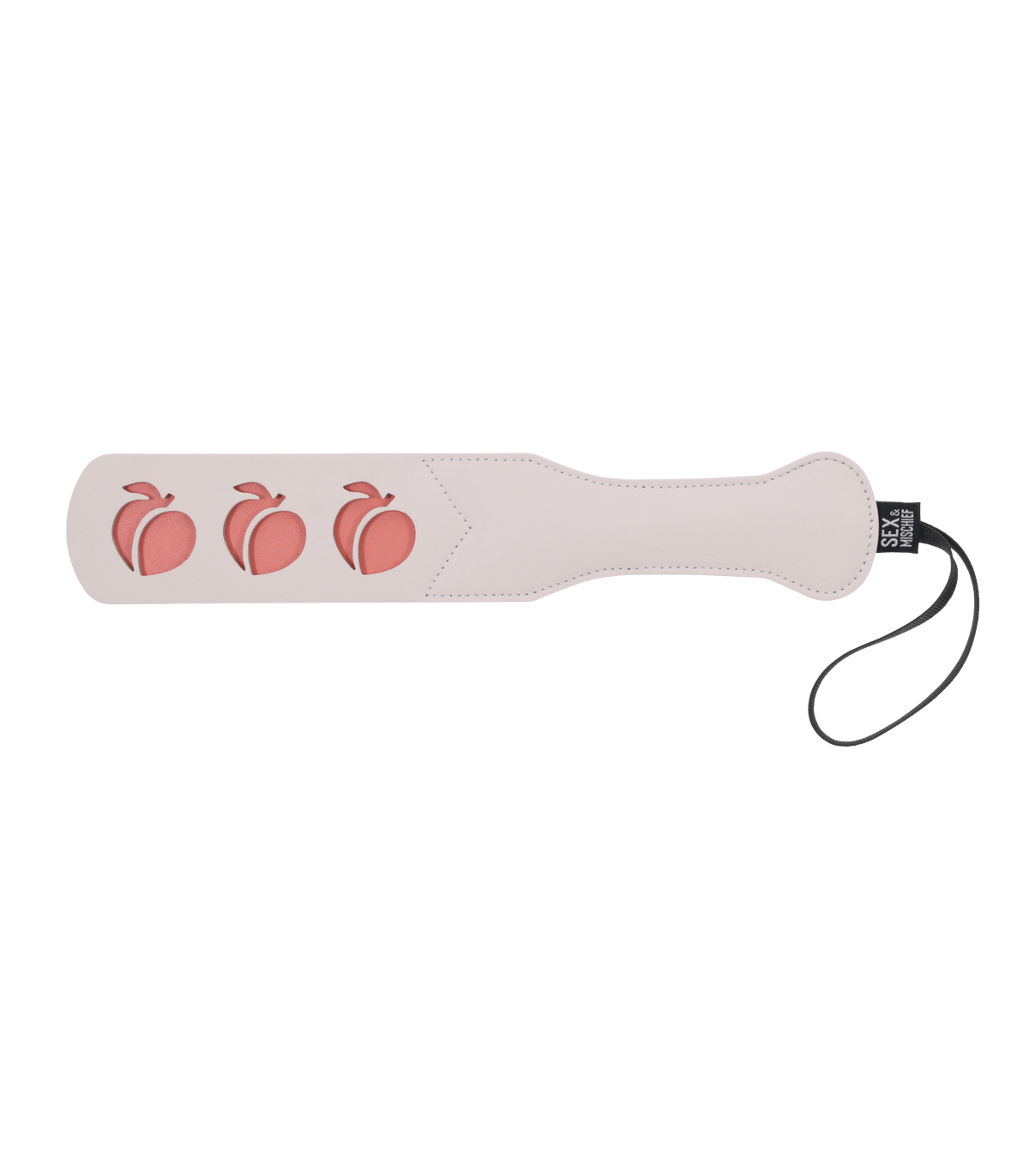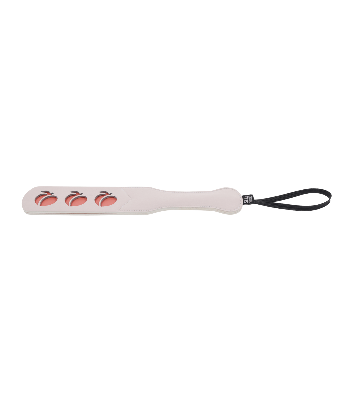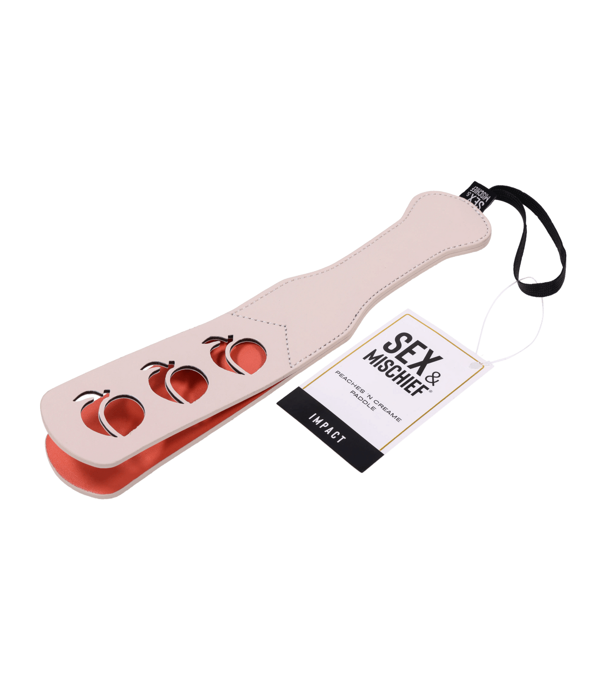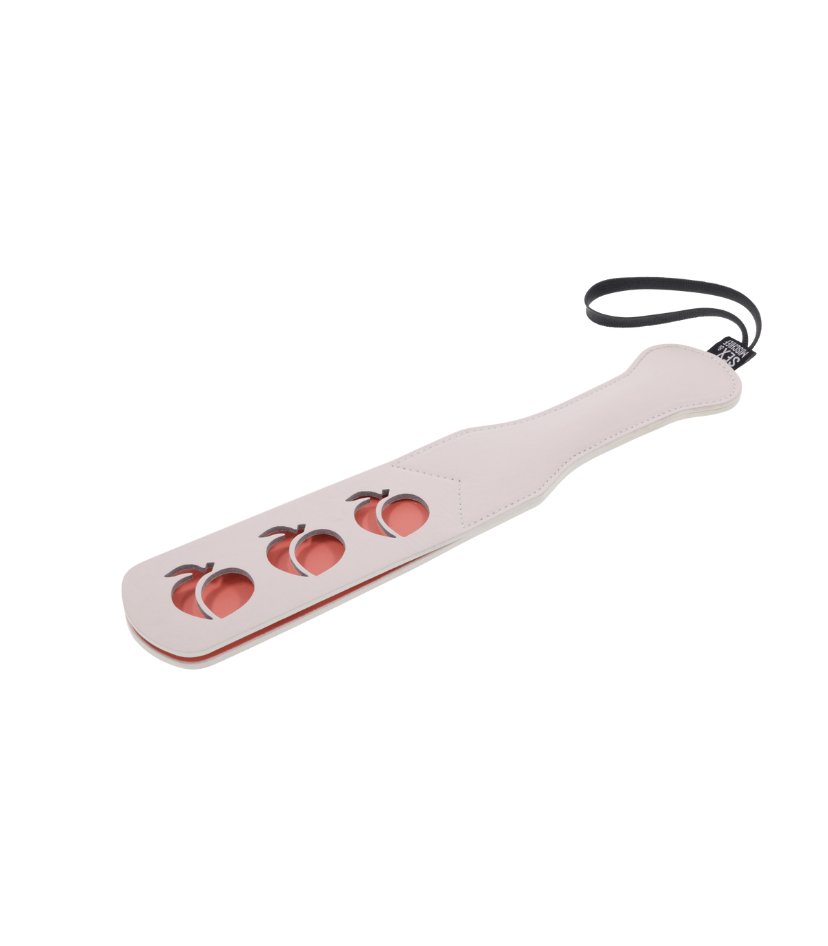 Get ready to add a fruity twist to your playful spanking with the Peaches 'n CreaMe Peach Paddle! This small but mighty paddle is designed for a delicious combination of fun and spicy sensations. Made from faux leather and adorned with adorable peach-shaped cutouts, it's as charming as it is effective. The split prongs deliver a satisfying tap, while the peach-shaped cutouts add a touch of whimsy with every smack to your partner's peach. Perfectly sized for a teasing tap or a firmer spank, the Peaches 'n CreaMe Peach Paddle is the ultimate accessory for a fun and flirty impact scene!