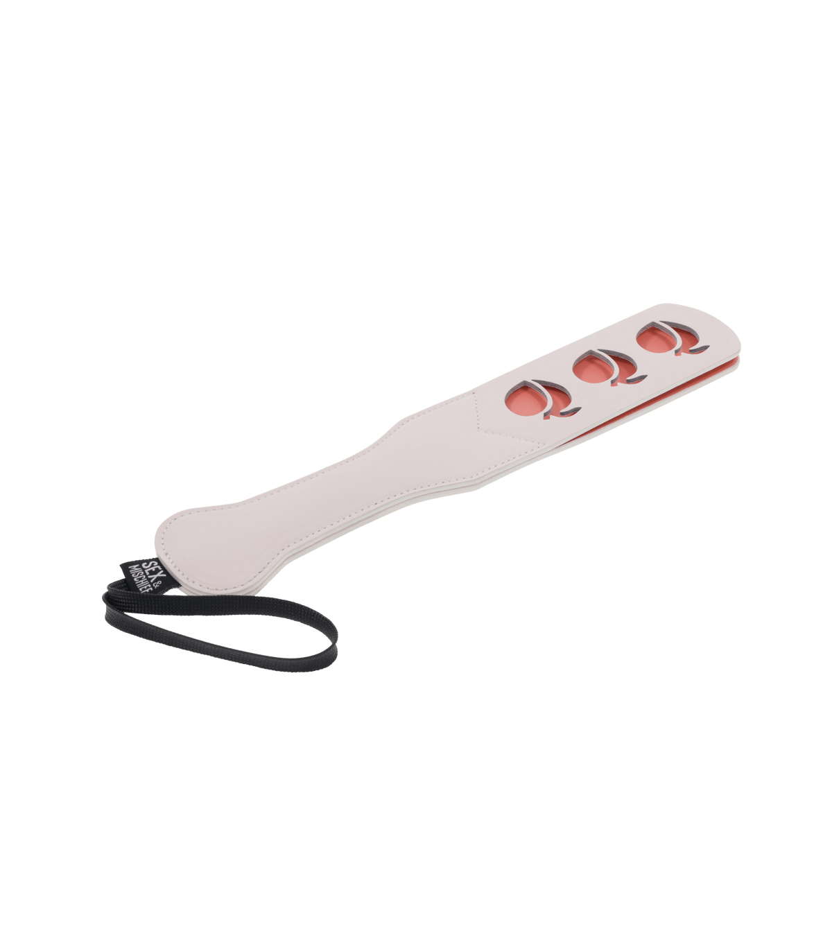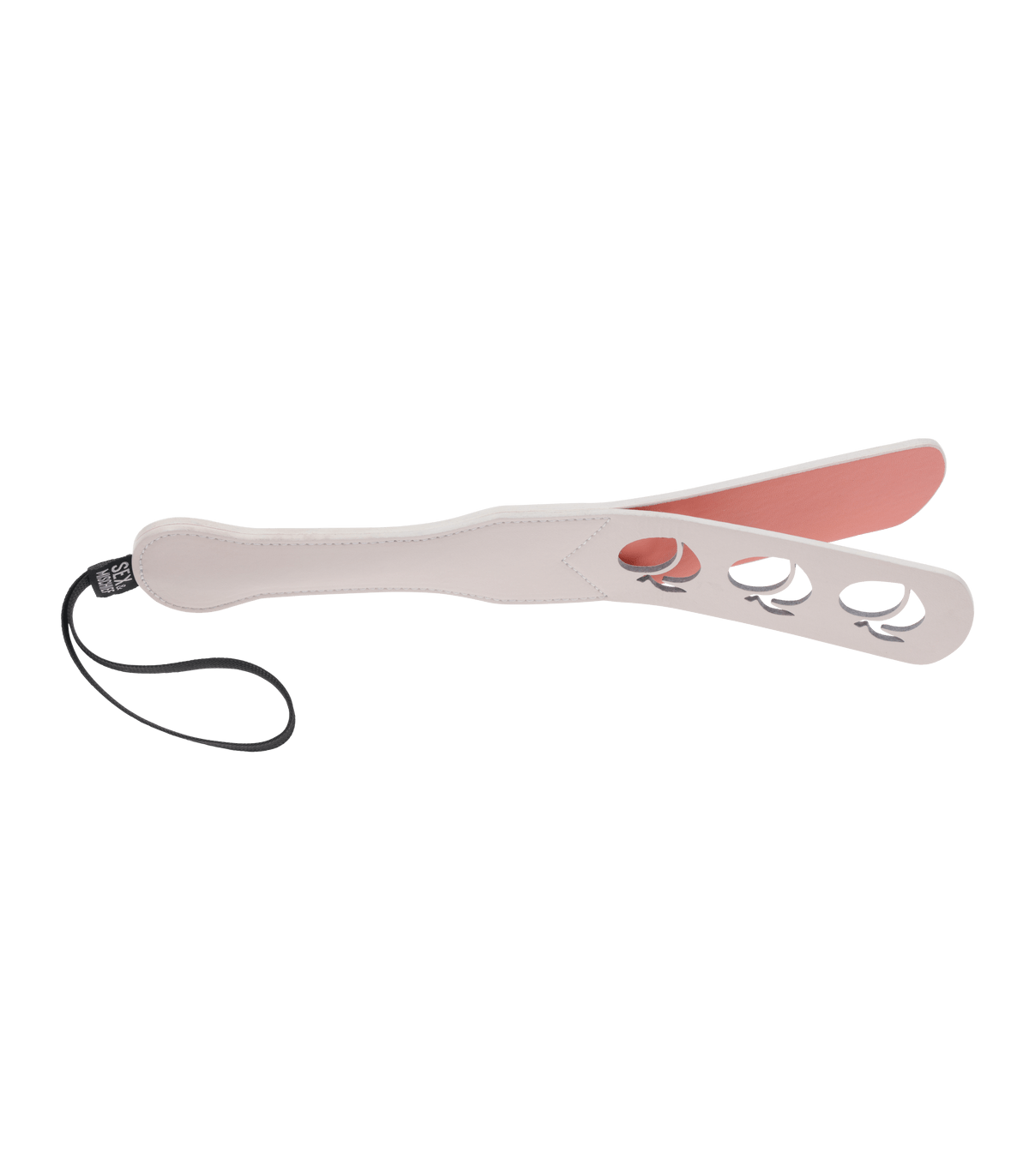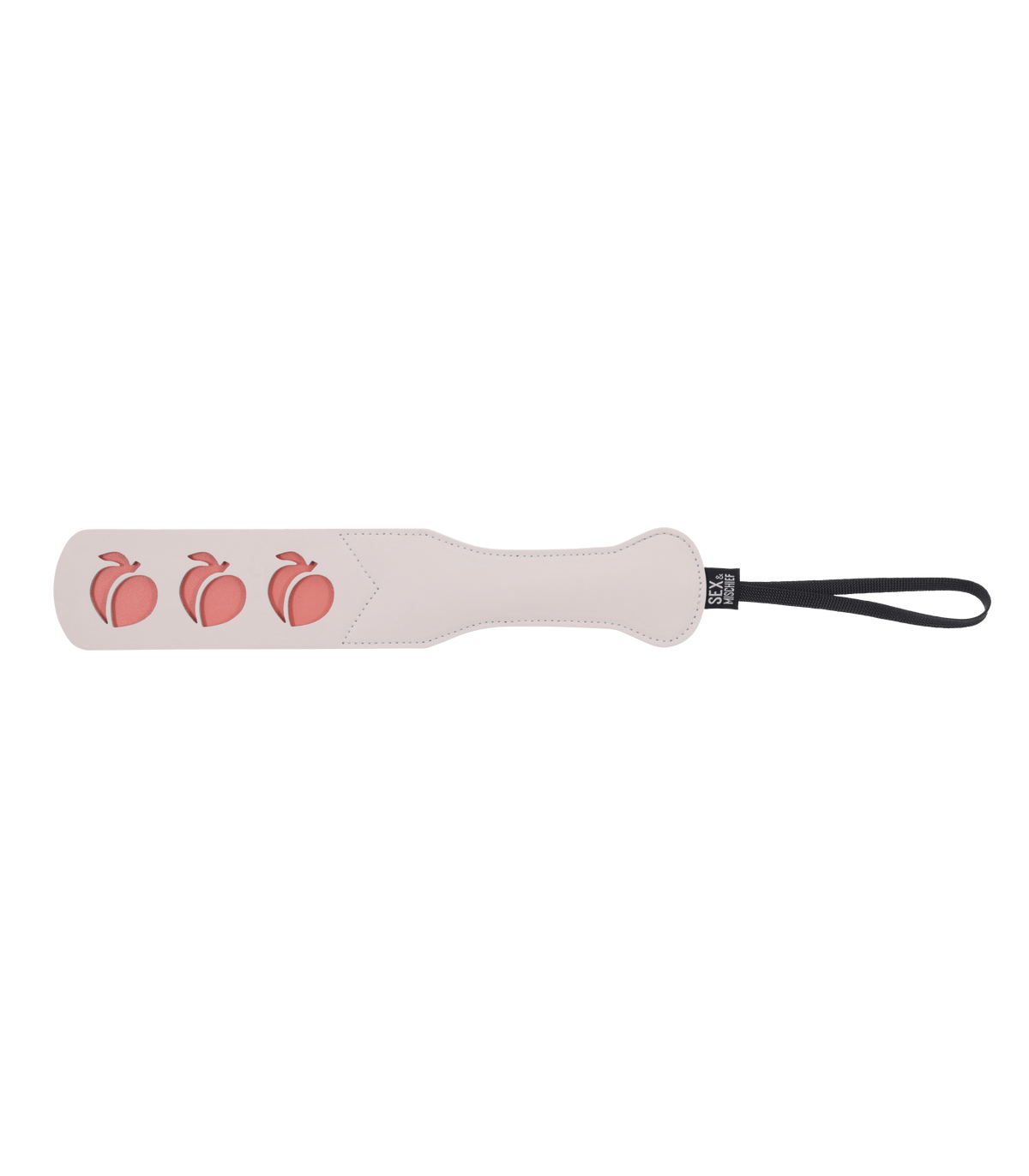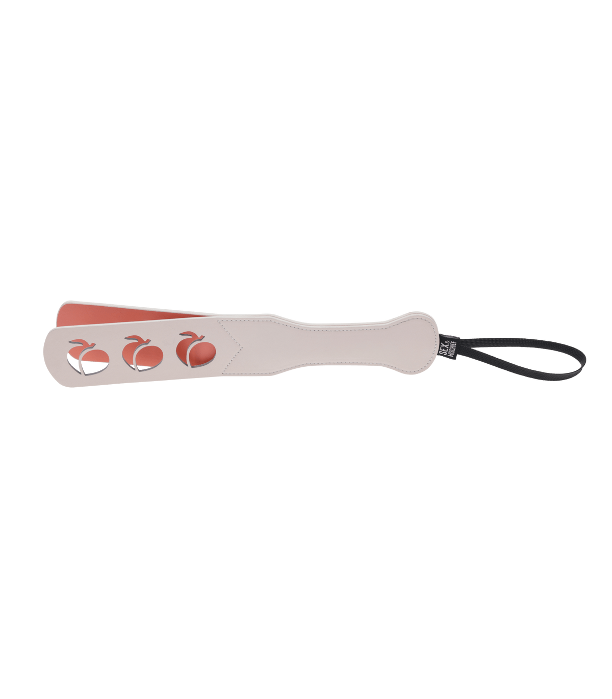 Get ready to add a fruity twist to your playful spanking with the Peaches 'n CreaMe Peach Paddle! This small but mighty paddle is designed for a delicious combination of fun and spicy sensations. Made from faux leather and adorned with adorable peach-shaped cutouts, it's as charming as it is effective. The split prongs deliver a satisfying tap, while the peach-shaped cutouts add a touch of whimsy with every smack to your partner's peach. Perfectly sized for a teasing tap or a firmer spank, the Peaches 'n CreaMe Peach Paddle is the ultimate accessory for a fun and flirty impact scene!