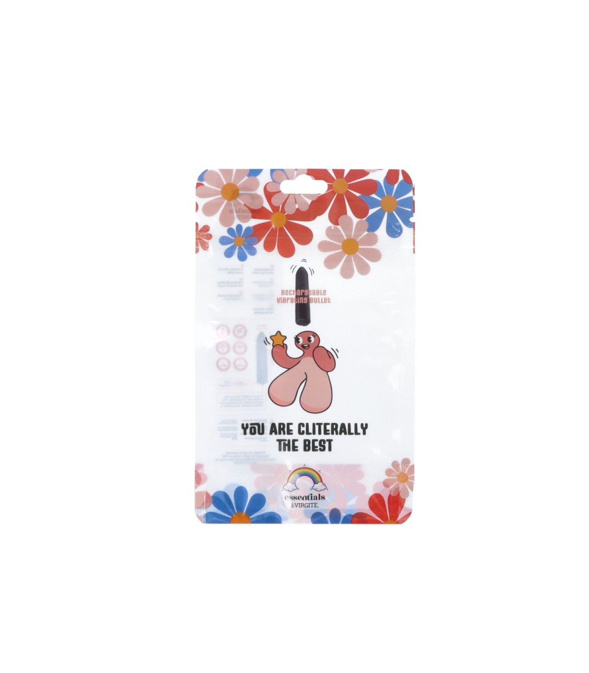 Rechargeable vibrating bullet via USB cable with different speeds and intensities, presented in a decorated bag.