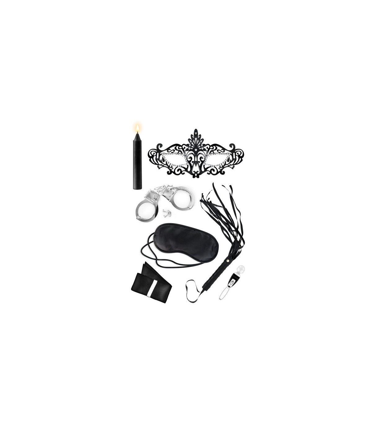 Kit consisting of mask, candle, mini-vibrator, handcuffs, blindfold, whip and satin ribbon.