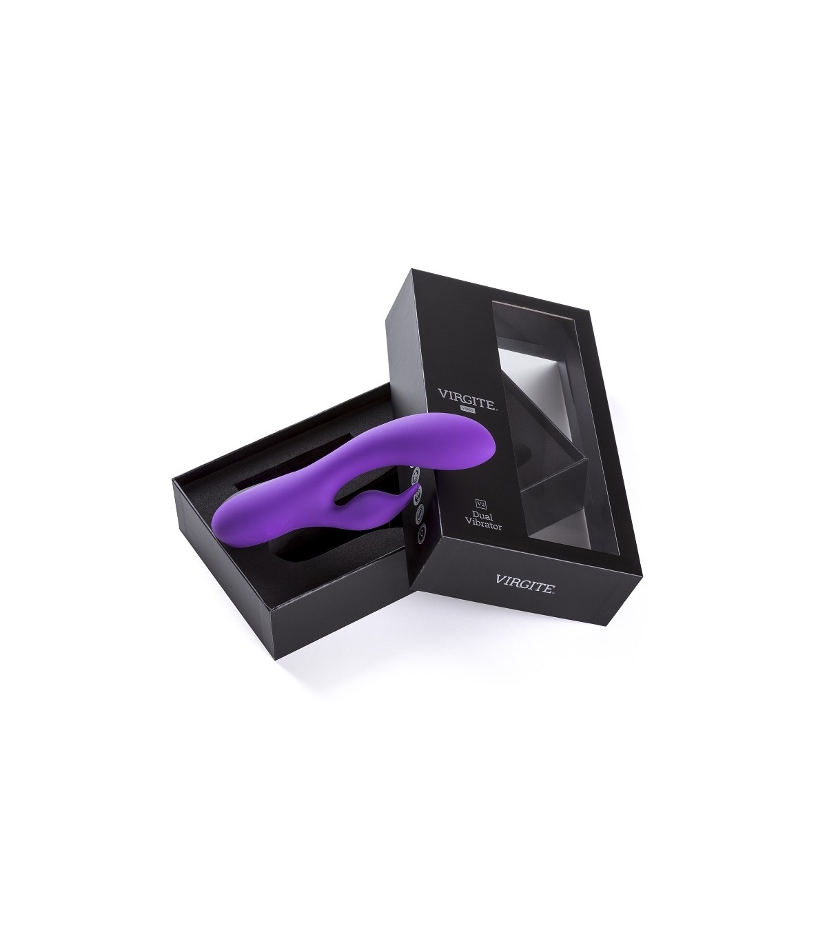 Rechargeable vibrator with clitoral stimulator made of high quality silky soft silicone. Presented in an elegant window box.