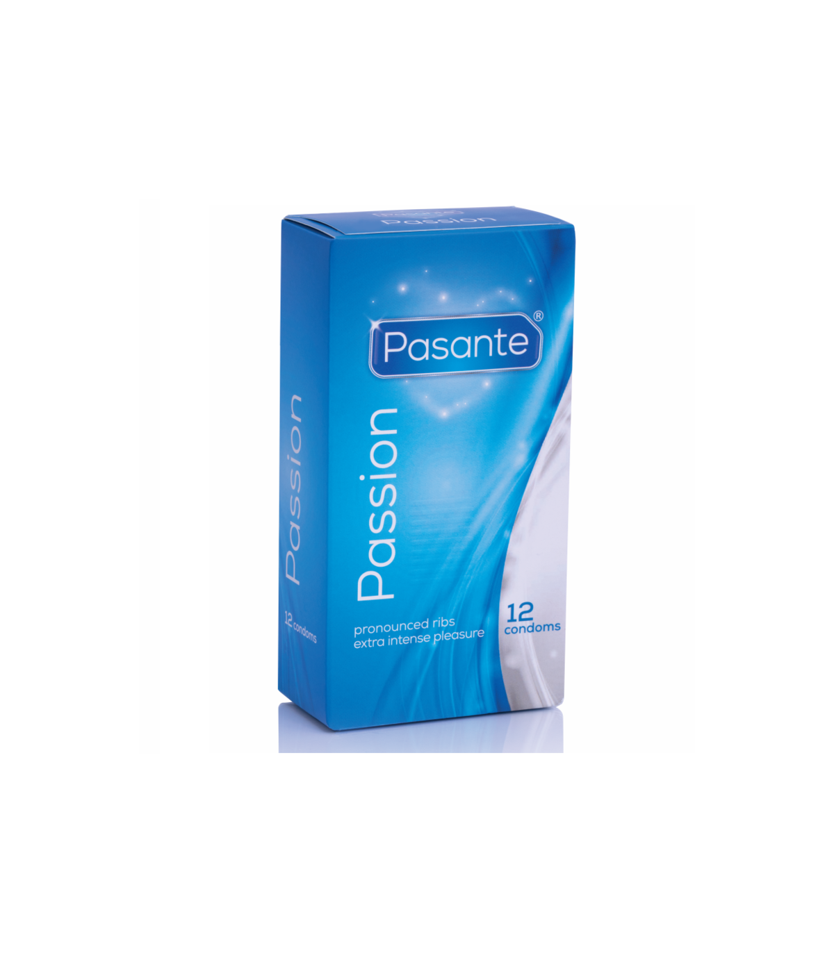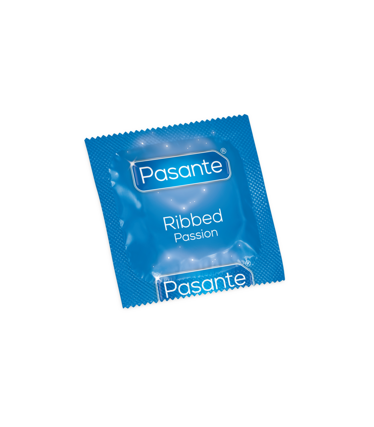 Pasante Ribbed Passion condoms have parallel sides with a defined ribbed texture for intense pleasure. Natural in color and with a teat tip.