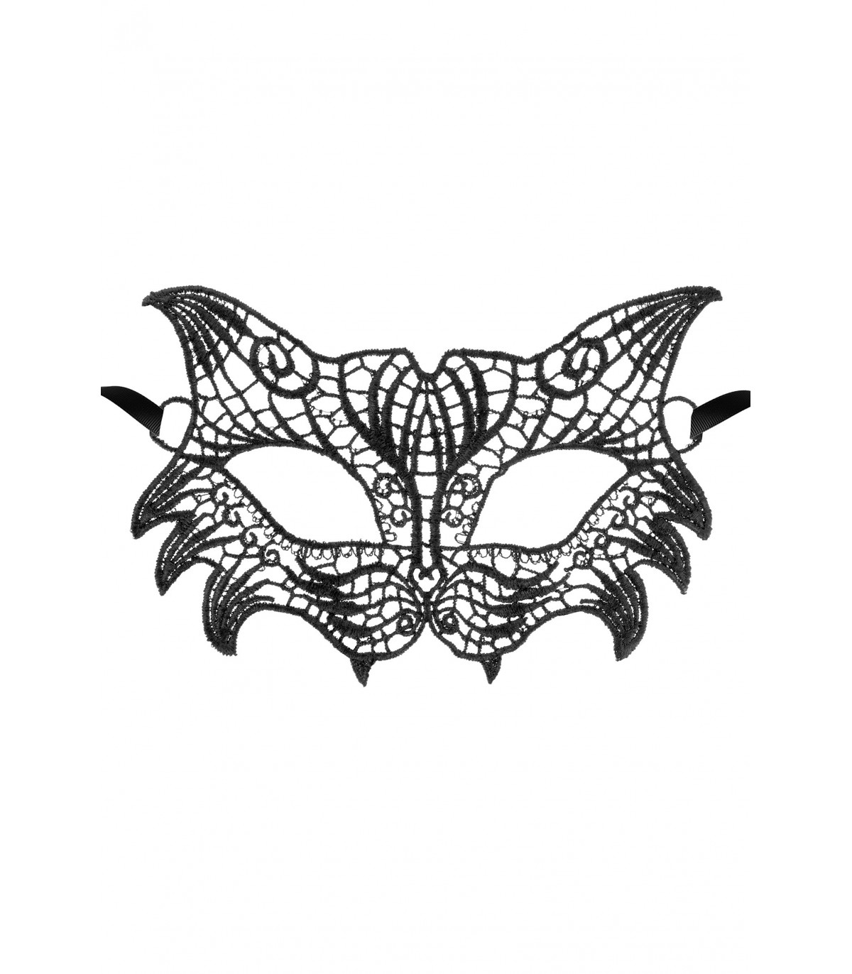 Maschera flessibile realizzata in guipure con due cinturini in raso sui lati per una migliore vestibilità a qualsiasi taglia.