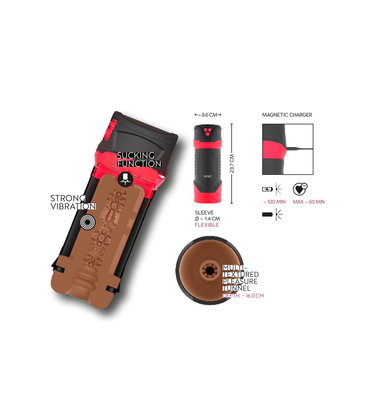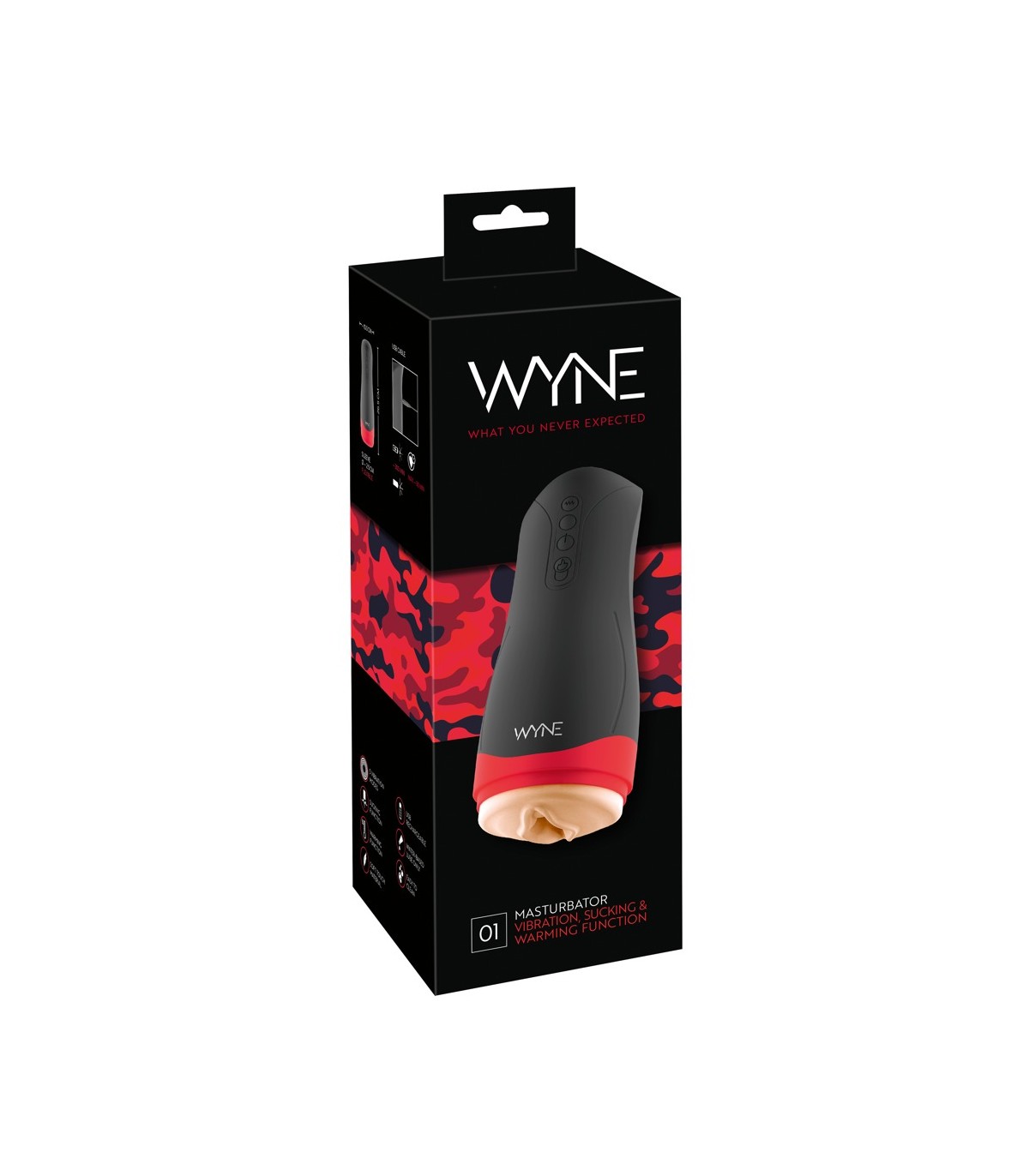 Pratico masturbatore WYNE 01 con eccitante custodia morbida simile a una vagina all'interno. Inoltre, ha una funzione di riscaldamento fino a 42°C, 5 diverse modalità di vibrazione in 3 velocità e una funzione di aspirazione intensiva in 3 modalità. Tutte le funzioni possono essere controllate separatamente o in combinazione con la semplice pressione di un pulsante direttamente sul giocattolo.