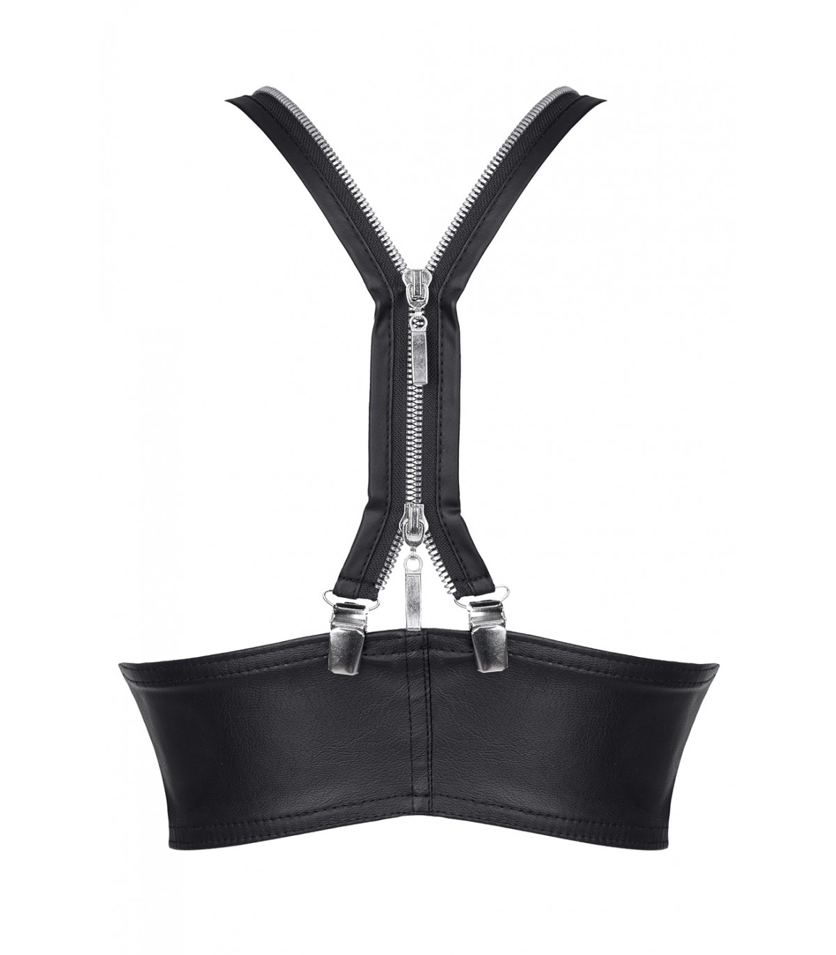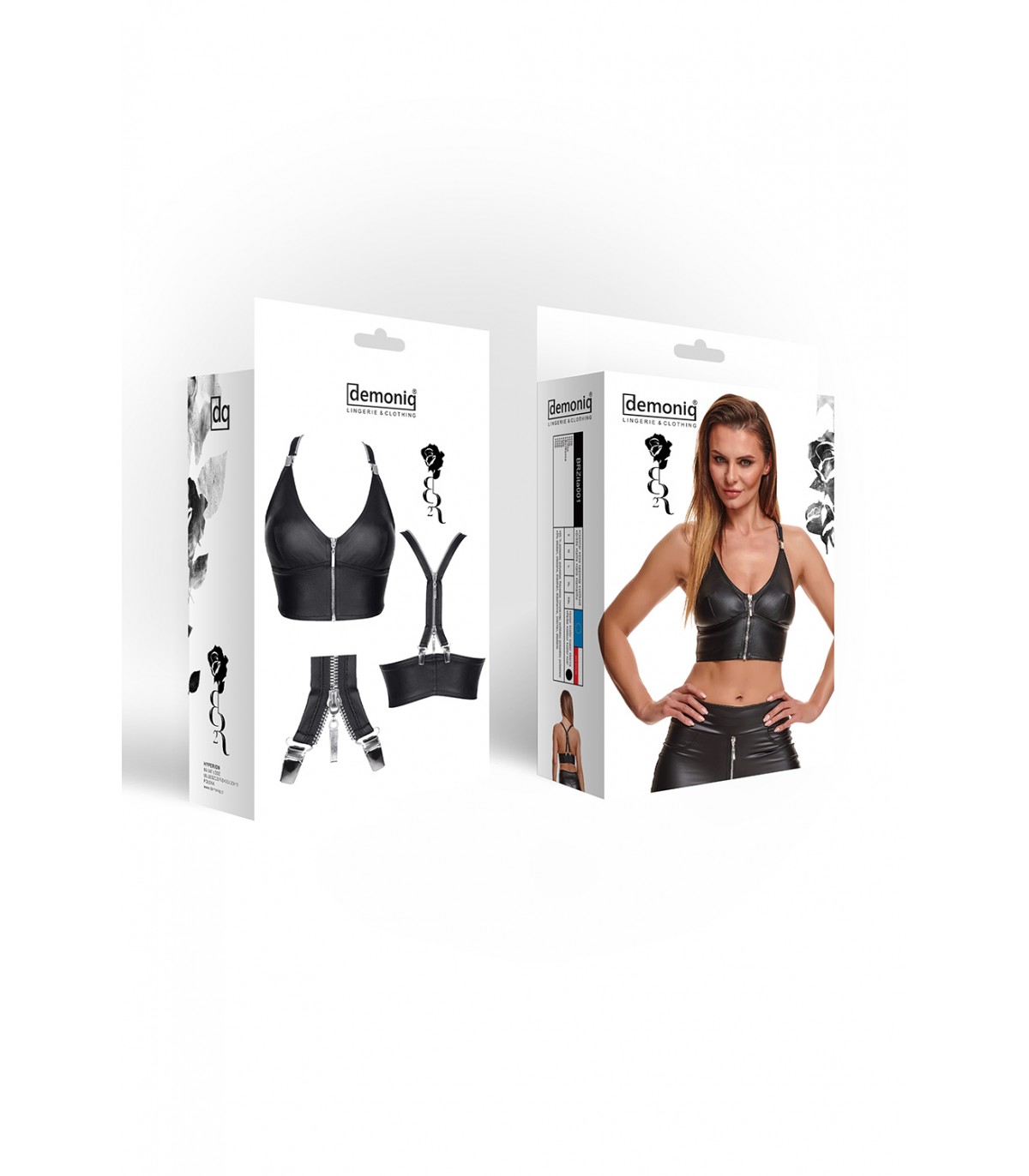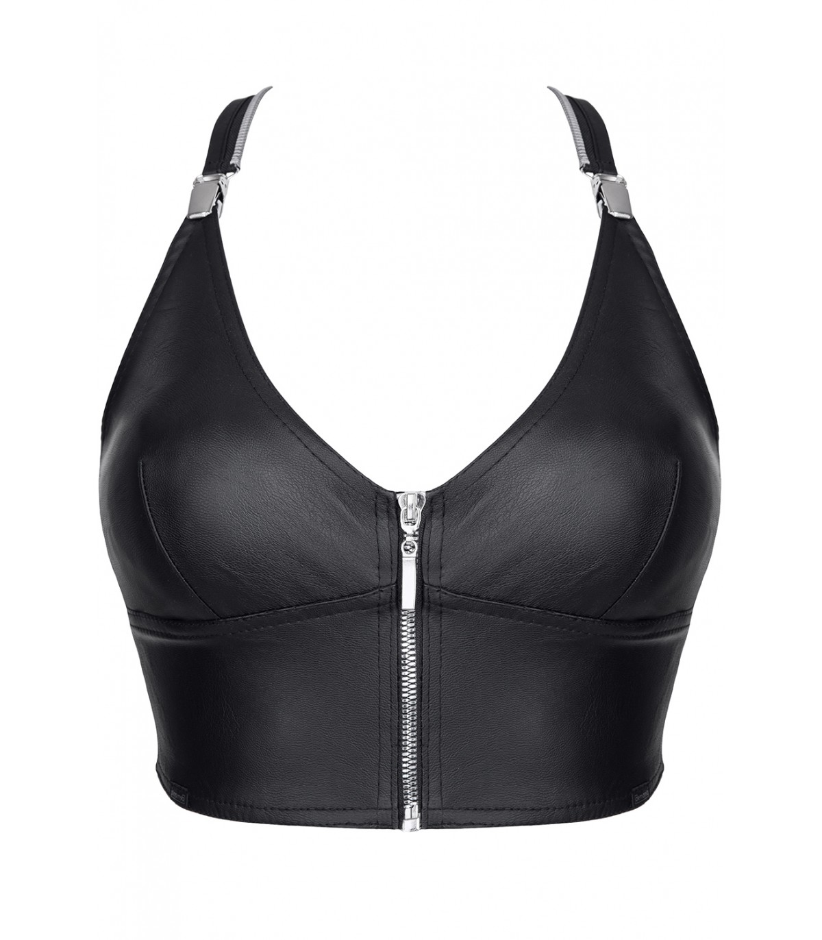 Top corto con coppe sagomate. La parte anteriore ha una scollatura sorprendente e una cerniera decorativa. Cinghie rimovibili, grazie al loro design sono davvero uniche e dall'aspetto moderno. Sono costituiti da chiusure decorative e da una cerniera, anch'essa decorativa e che serve per regolare la lunghezza delle spalline. La parte superiore è realizzata interamente in ecopelle elastica nera con texture in vera pelle. È piacevole al tatto e si adatta perfettamente al corpo.