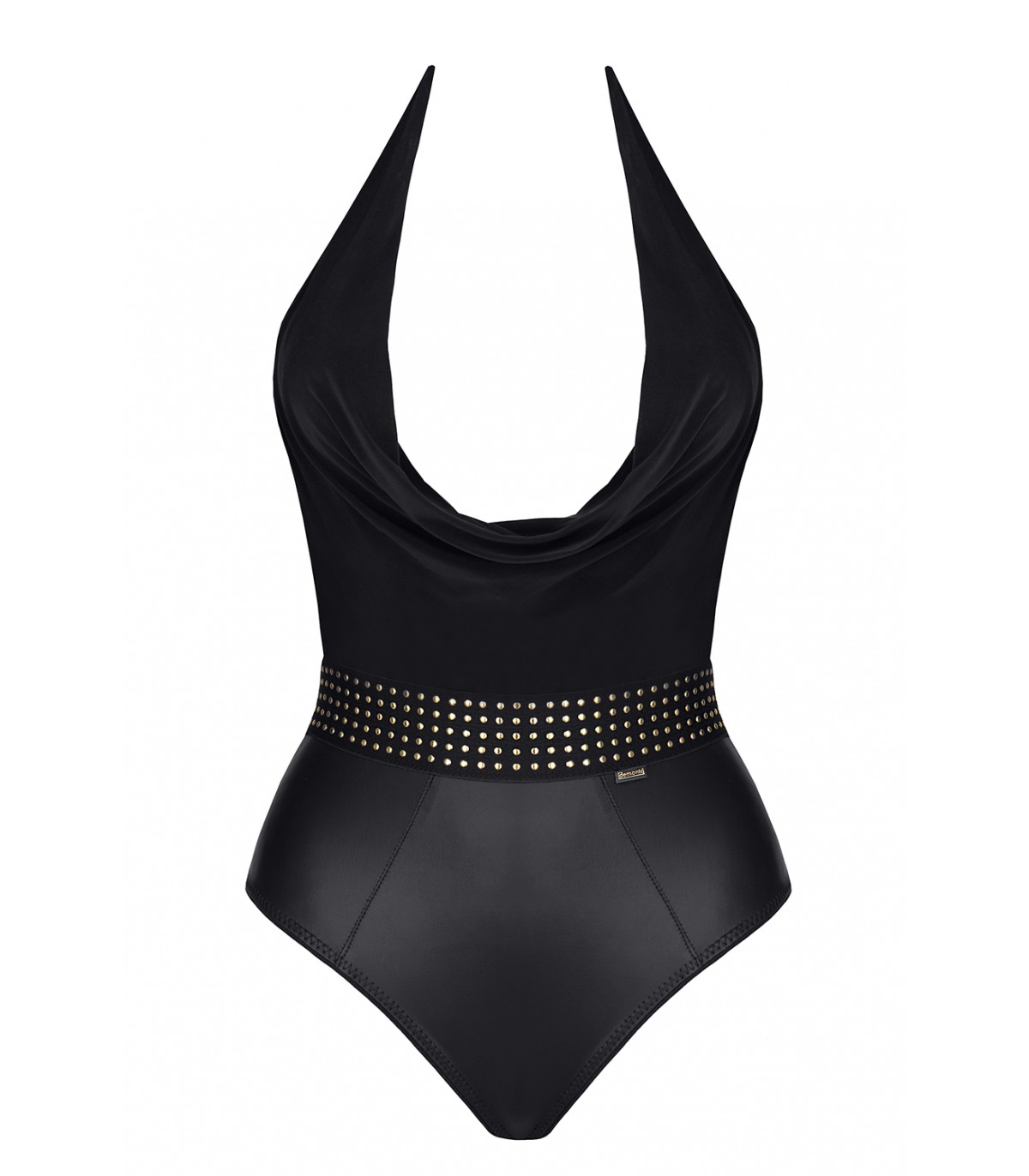 Body realizzato in tessuto nero, elastico e piacevole al tatto, con effetto bagnato elastico nero. La combinazione di queste 2 materie prime è molto significativa. Nella parte inferiore, l'effetto bagnato leggermente lucido mette in risalto magnificamente le curve dei fianchi e dei glutei. Nella parte superiore In questa parte, il tessuto in maglia nera si adatta molto bene al petto, con uno scollo molto appariscente ed elegante. In vita è presente una fascia elastica decorativa nera con applicazioni dorate. Sembra bello, ma evidenzia anche otticamente la vita