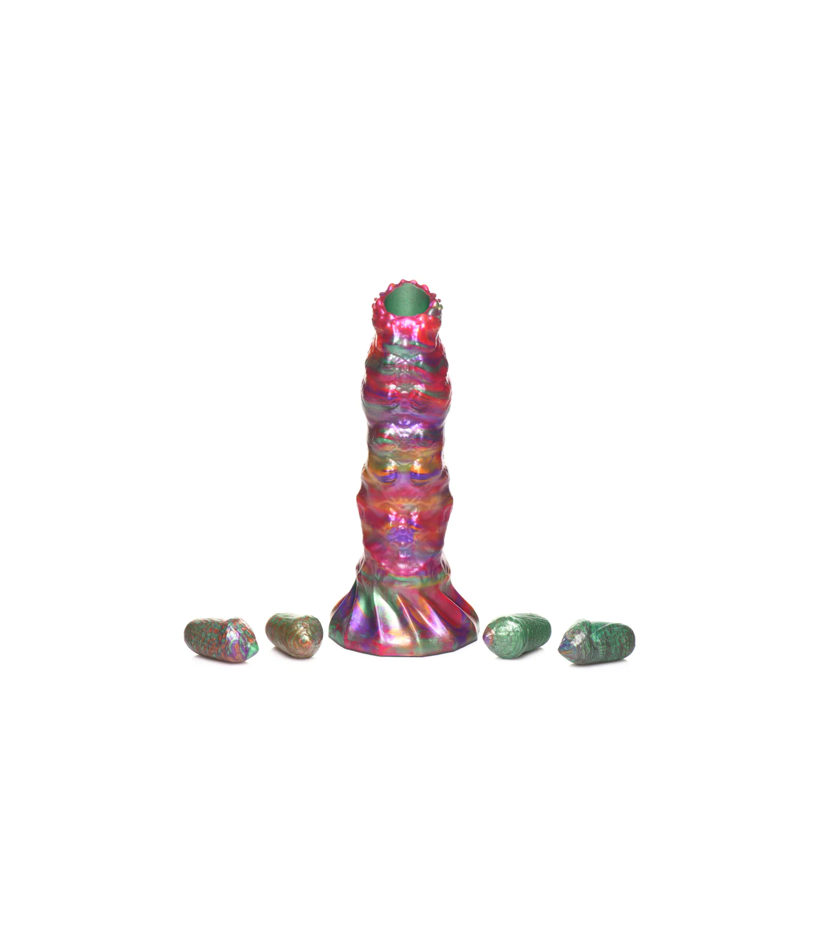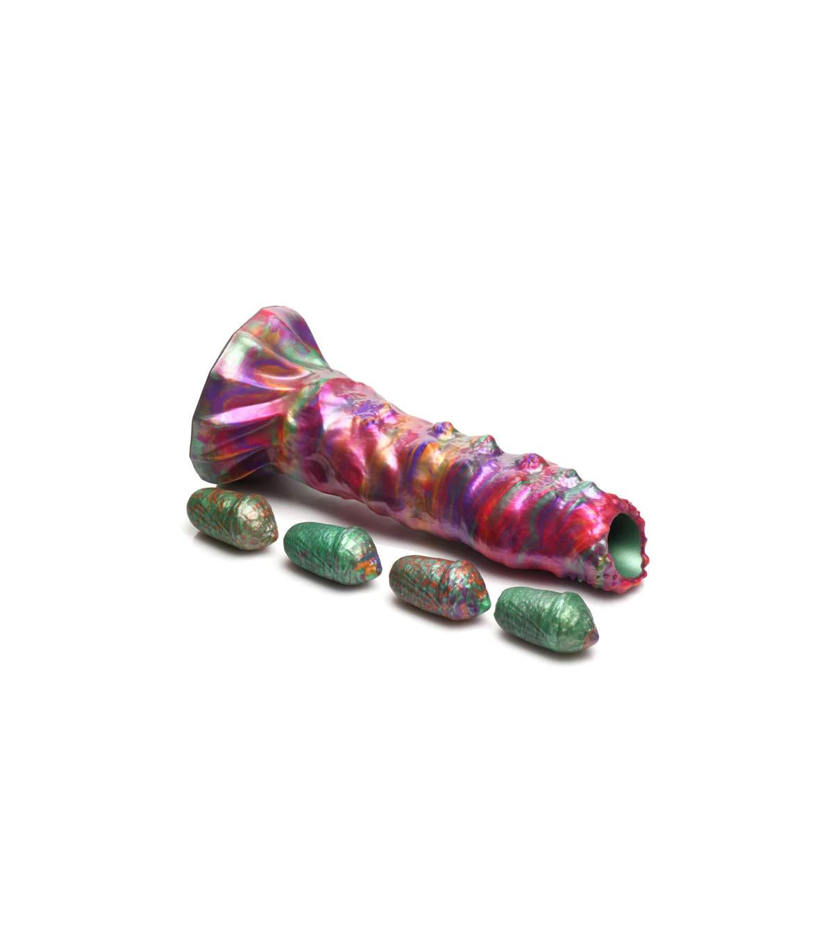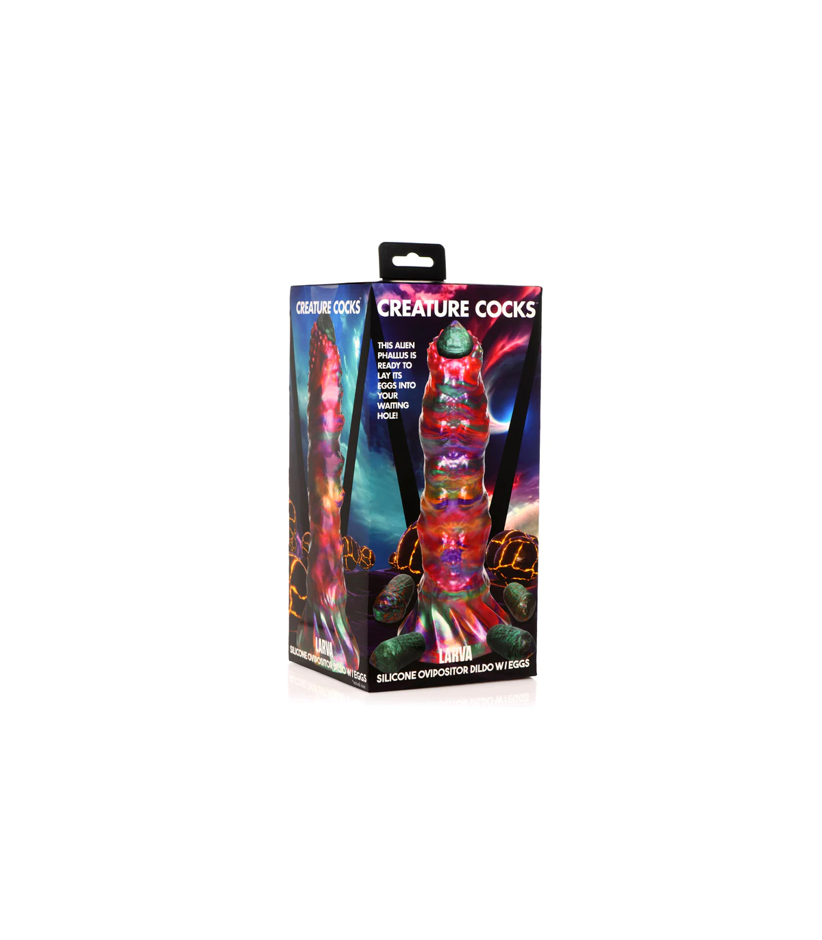 È ora di essere accoppiati con visitatori alieni. Questo dildo dalla texture ruvida di Creature Cocks è uno dei più colorati in assoluto, con un mix di colori intensi, vibranti e iridescenti, con sfumature di rosa, verde, arancione e viola. Il dildo è ampio e spesso, con piccole protuberanze sulla punta, una texture scanalata sul lato opposto e un mix di texture lungo il pene fino all'ampia base a ventosa. Può essere utilizzato a mani libere con l'ausilio della ventosa o in combinazione con un'imbracatura compatibile per un gioco penetrativo con strap-on o pegging. Inserisci una o tutte le uova di larva nella guaina cava e poi infilala nel tuo buco, lasciando che l'ovopositore le depositi per farle schiudere in seguito, una volta sazio. Realizzati in silicone flessibile, super liscio e di alta qualità, sia il dildo che le uova sono privi di ftalati, sicuri per il corpo e si consiglia di utilizzarli esclusivamente con lubrificanti a base d'acqua. Per la pulizia successiva, utilizzare acqua tiepida e sapone delicato, quindi spruzzare con un detergente per giocattoli prima di asciugare.