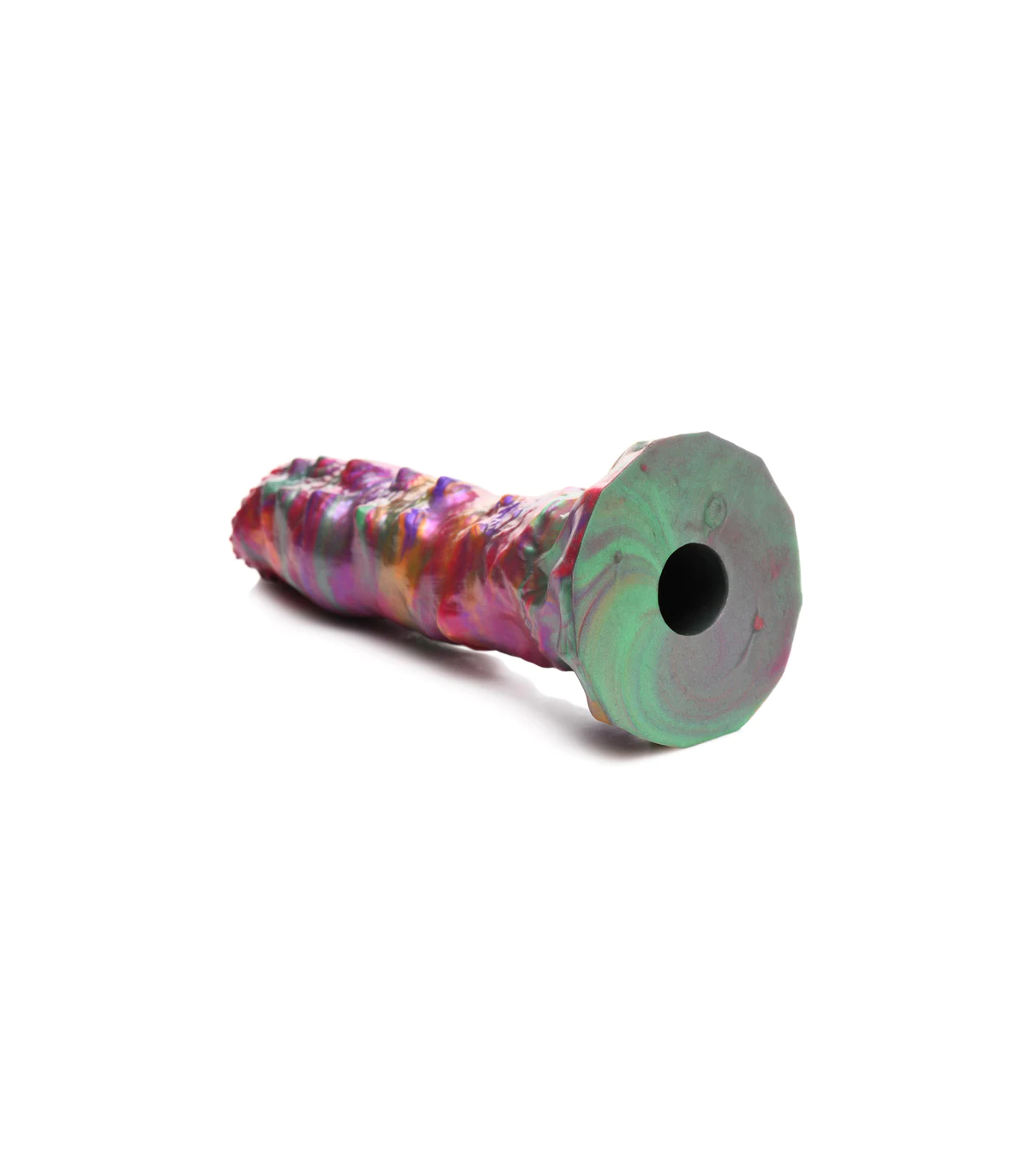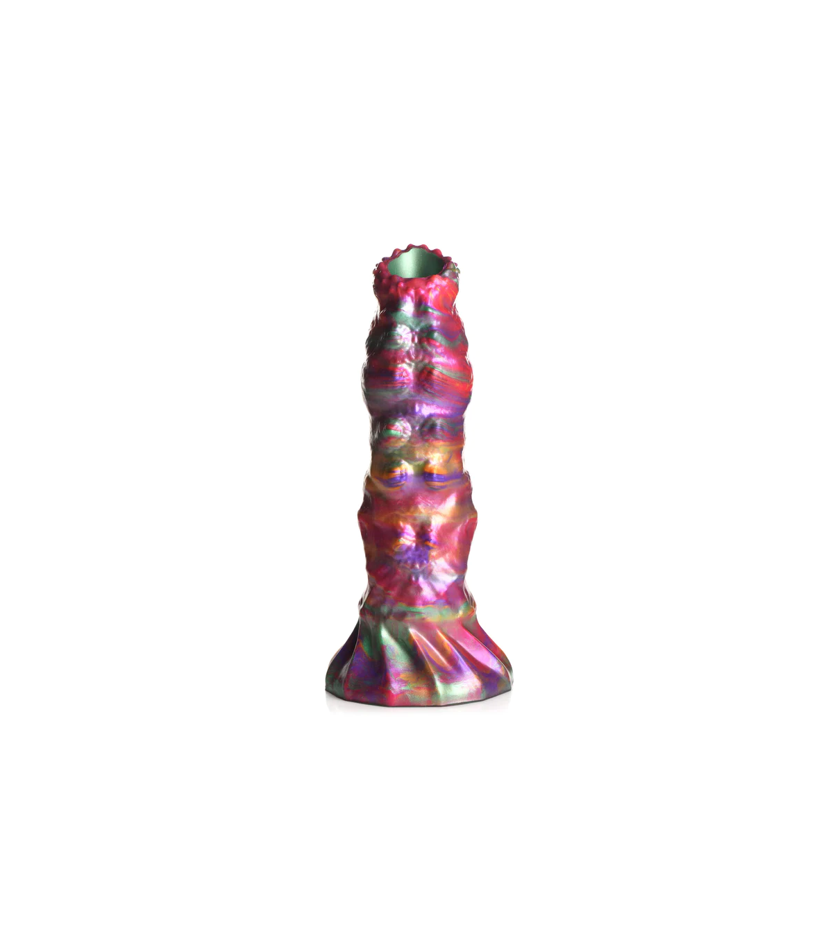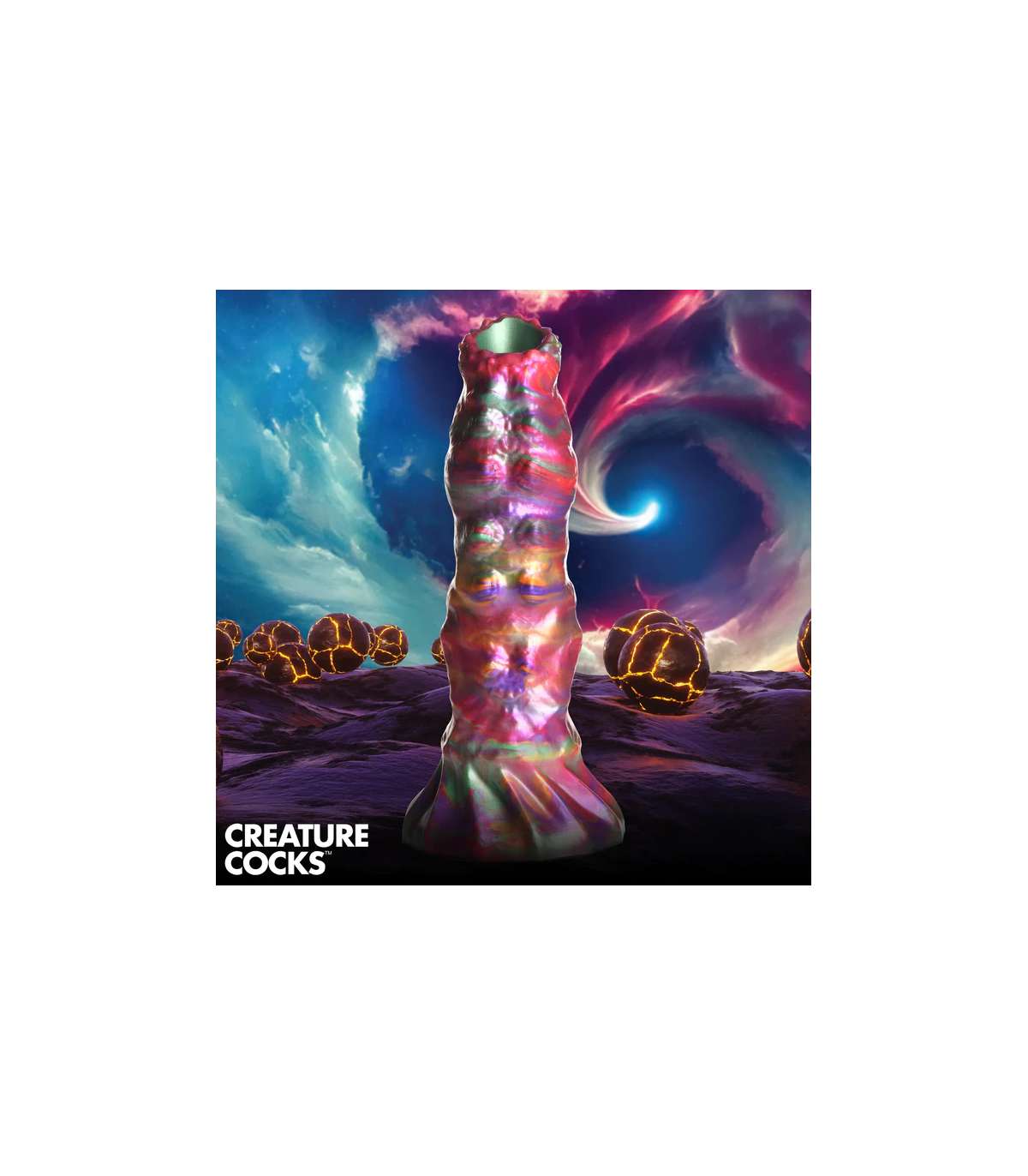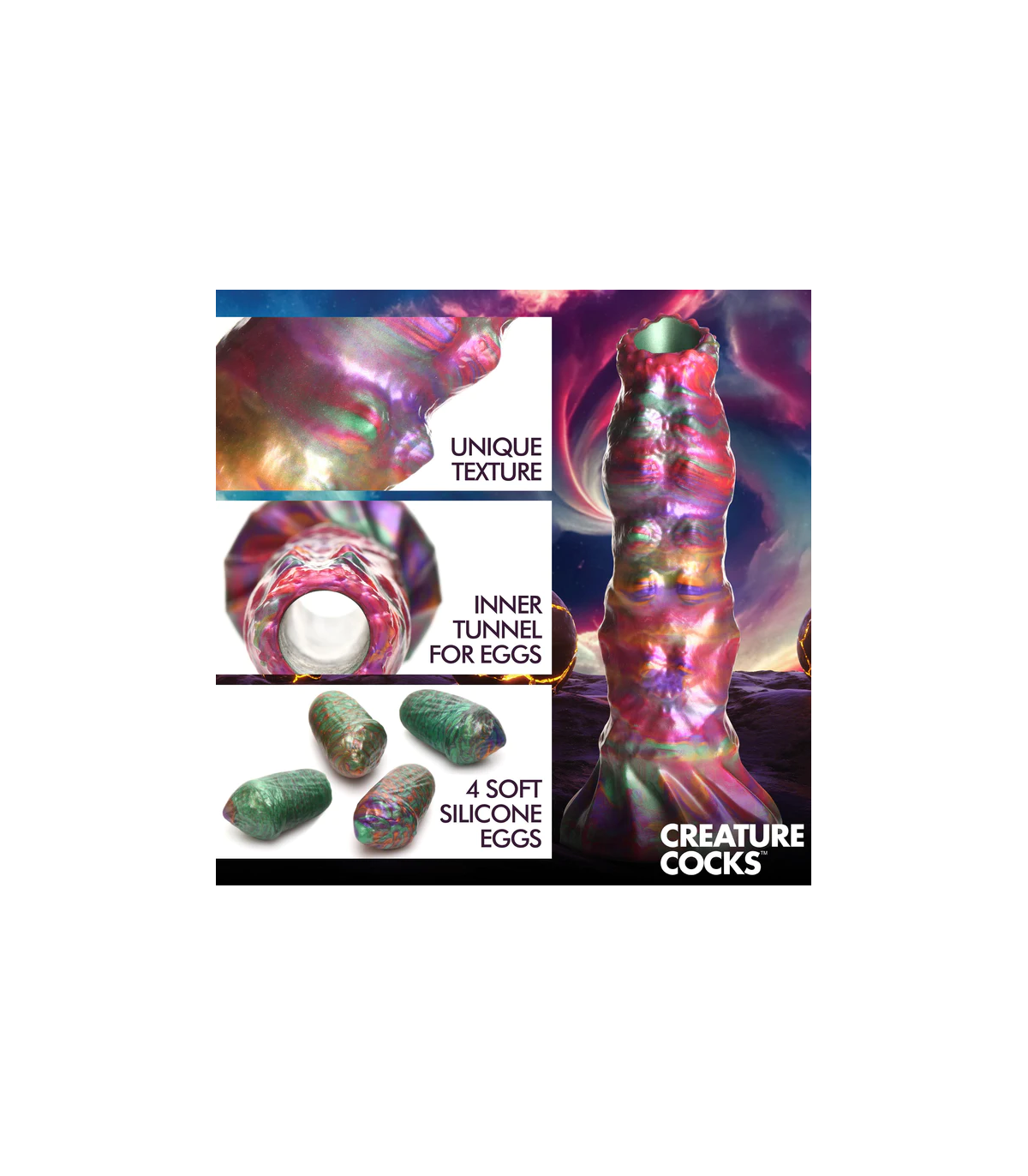 È ora di essere accoppiati con visitatori alieni. Questo dildo dalla texture ruvida di Creature Cocks è uno dei più colorati in assoluto, con un mix di colori intensi, vibranti e iridescenti, con sfumature di rosa, verde, arancione e viola. Il dildo è ampio e spesso, con piccole protuberanze sulla punta, una texture scanalata sul lato opposto e un mix di texture lungo il pene fino all'ampia base a ventosa. Può essere utilizzato a mani libere con l'ausilio della ventosa o in combinazione con un'imbracatura compatibile per un gioco penetrativo con strap-on o pegging. Inserisci una o tutte le uova di larva nella guaina cava e poi infilala nel tuo buco, lasciando che l'ovopositore le depositi per farle schiudere in seguito, una volta sazio. Realizzati in silicone flessibile, super liscio e di alta qualità, sia il dildo che le uova sono privi di ftalati, sicuri per il corpo e si consiglia di utilizzarli esclusivamente con lubrificanti a base d'acqua. Per la pulizia successiva, utilizzare acqua tiepida e sapone delicato, quindi spruzzare con un detergente per giocattoli prima di asciugare.