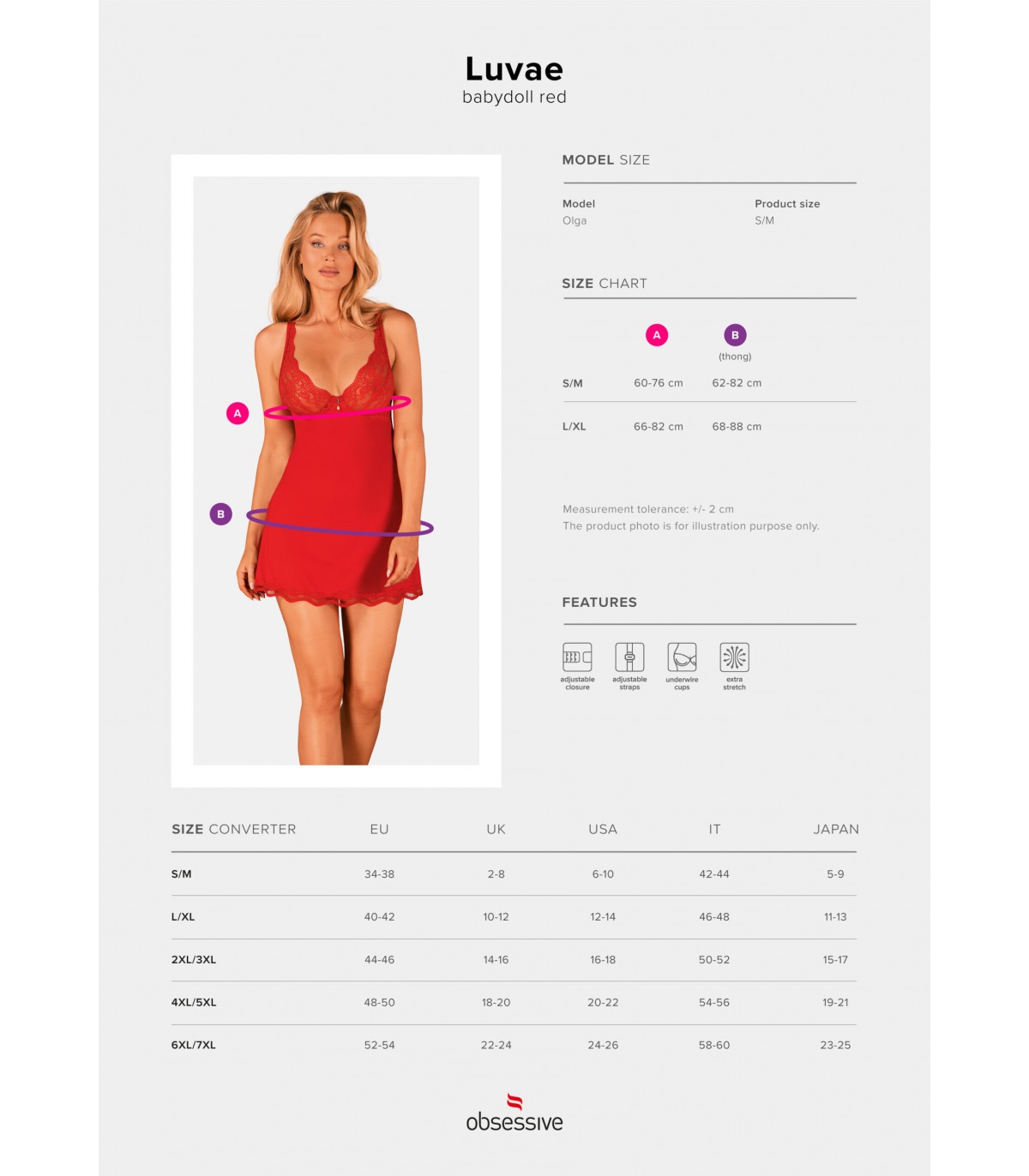 Il babydoll Luvae dona sensualità e fascino grazie al suo bellissimo reggiseno e alla schiena sexy e scoperta! Ora, le notti che trascorrerai con il tuo amante saranno più calde e ancora più fantastiche! Lasciati trasportare da quel tipo di piacere.