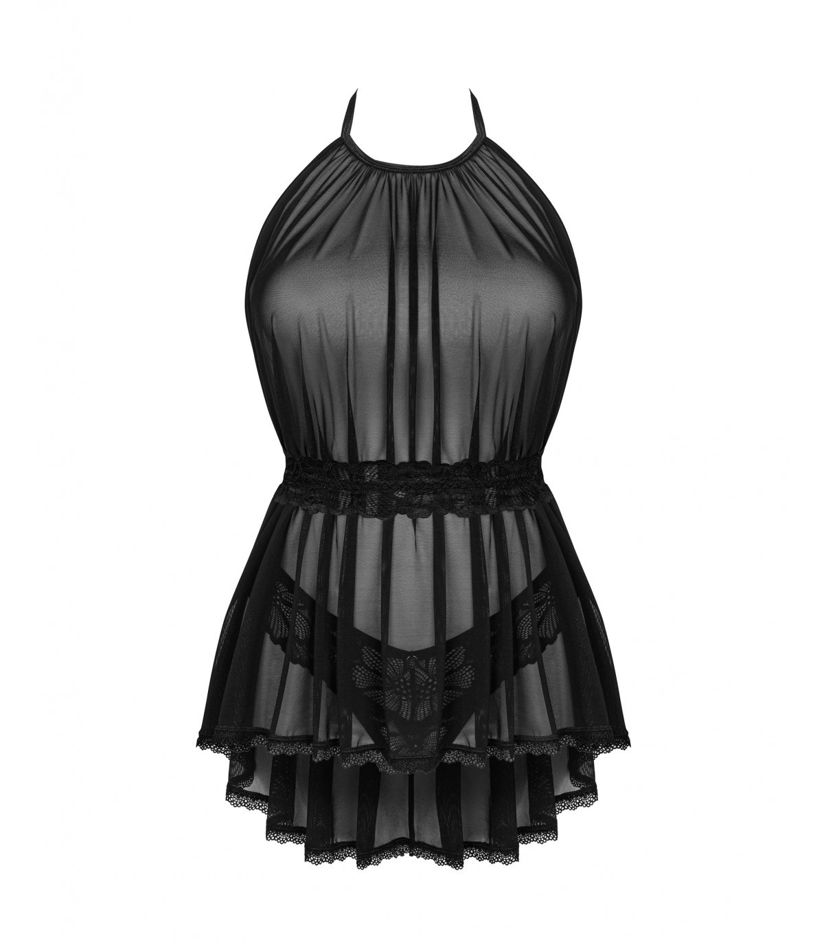 Con questo set sensuale la calda atmosfera è garantita! Questo babydoll della serie Serafia è realizzato in un materiale traslucido che aggiungerà mistero al tuo corpo e la tracolla renderà la tua schiena nuda incredibilmente seducente. La cintura in pizzo regolabile finemente decorata metterà in risalto perfettamente la tua vita, mentre il perizoma in pizzo floreale incluso nel set rivelerà i tuoi glutei. Saluta nuove sensazioni.