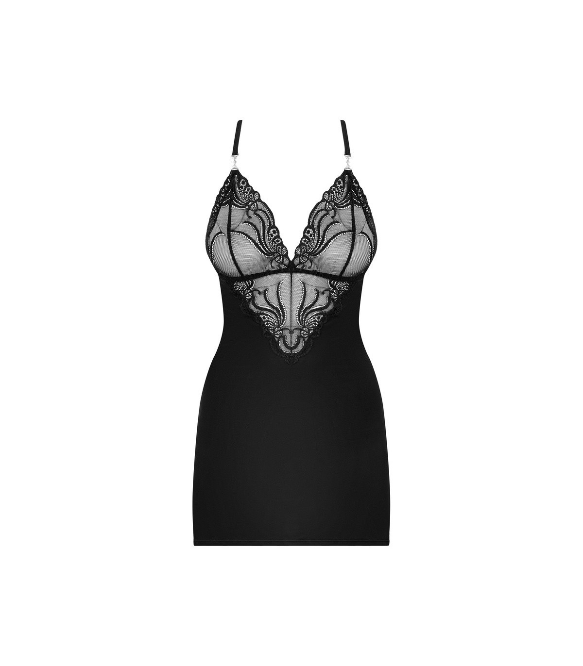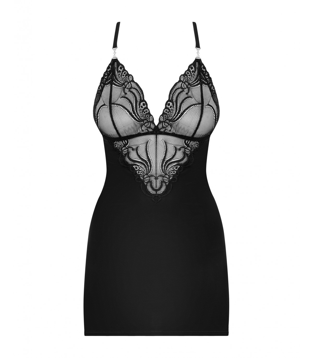 Bellissima canotta realizzata in un materiale delicato e molto morbido. Le spalline regolabili formano un sexy design incrociato sul retro. Gioielli lucenti tra coppe e spalline. Seducente scollatura in pizzo ornata da intriganti motivi. Il prodotto comprende canotta e perizoma. Tessuto piacevole e perfettamente elastico (90% poliammide, 10% elastan). )