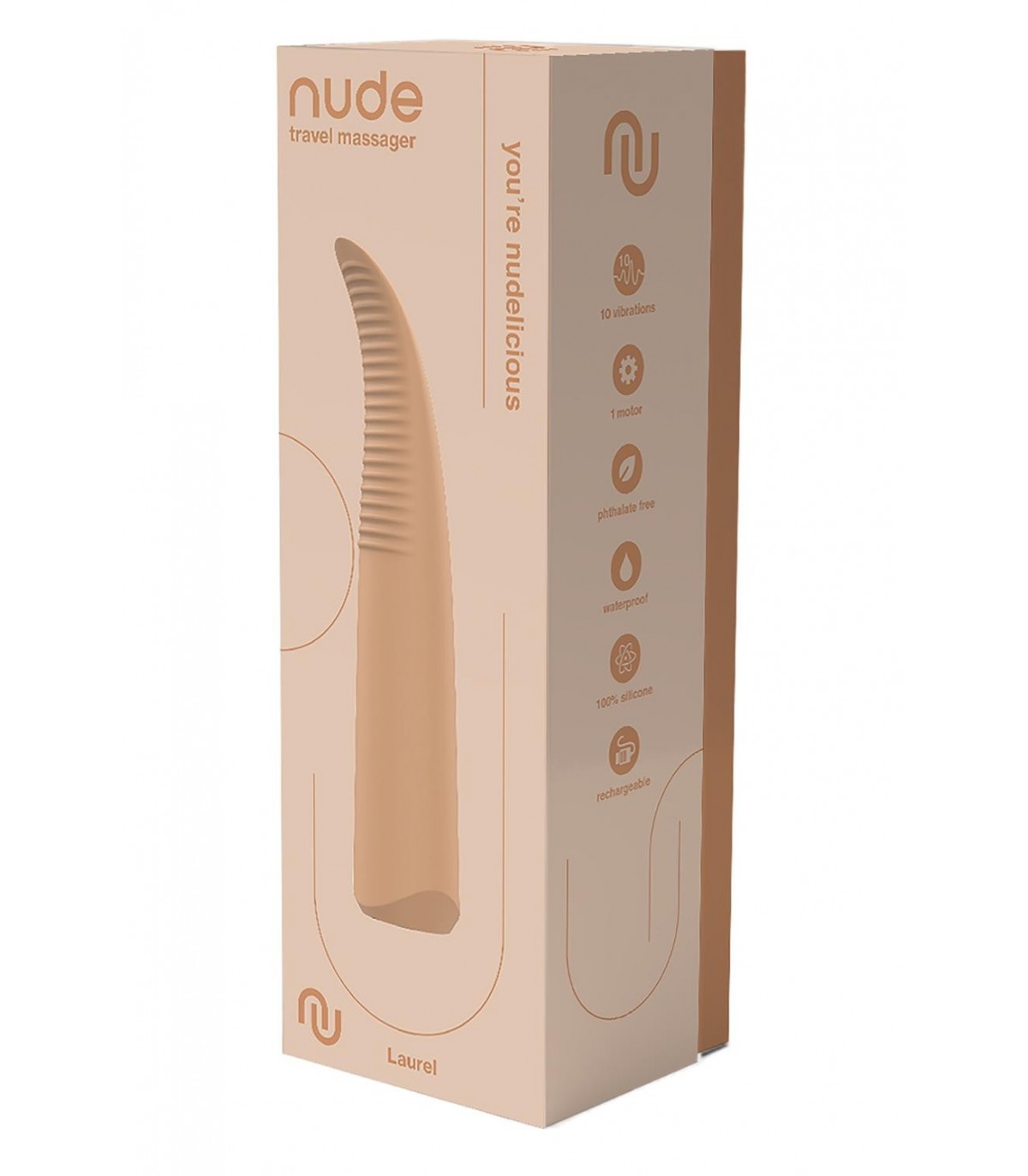 Questo massaggiatore da viaggio di Nude ha un funzionamento con un solo pulsante per passare attraverso 10 forti vibrazioni. Ha 7 ritmi e 3 velocità. La punta flessibile e le creste stimolanti rendono questo massaggiatore perfetto per i principianti e per tutti coloro che amano la stimolazione sottile e seducente. Il massaggiatore Nude Laurel è realizzato in morbido silicone liscio e ABS, privo di ftalati e sicuro per il corpo. Laurel ha una classificazione IPX6 per la resistenza all'acqua. Per ricaricarlo dopo l'uso, il vibratore è dotato di un foro di ricarica impermeabile. Un cavo con presa USB è incluso. Dopo una ricarica completa, la tua atmosfera Nude sarà pronta per 90 minuti di piacere nudo.