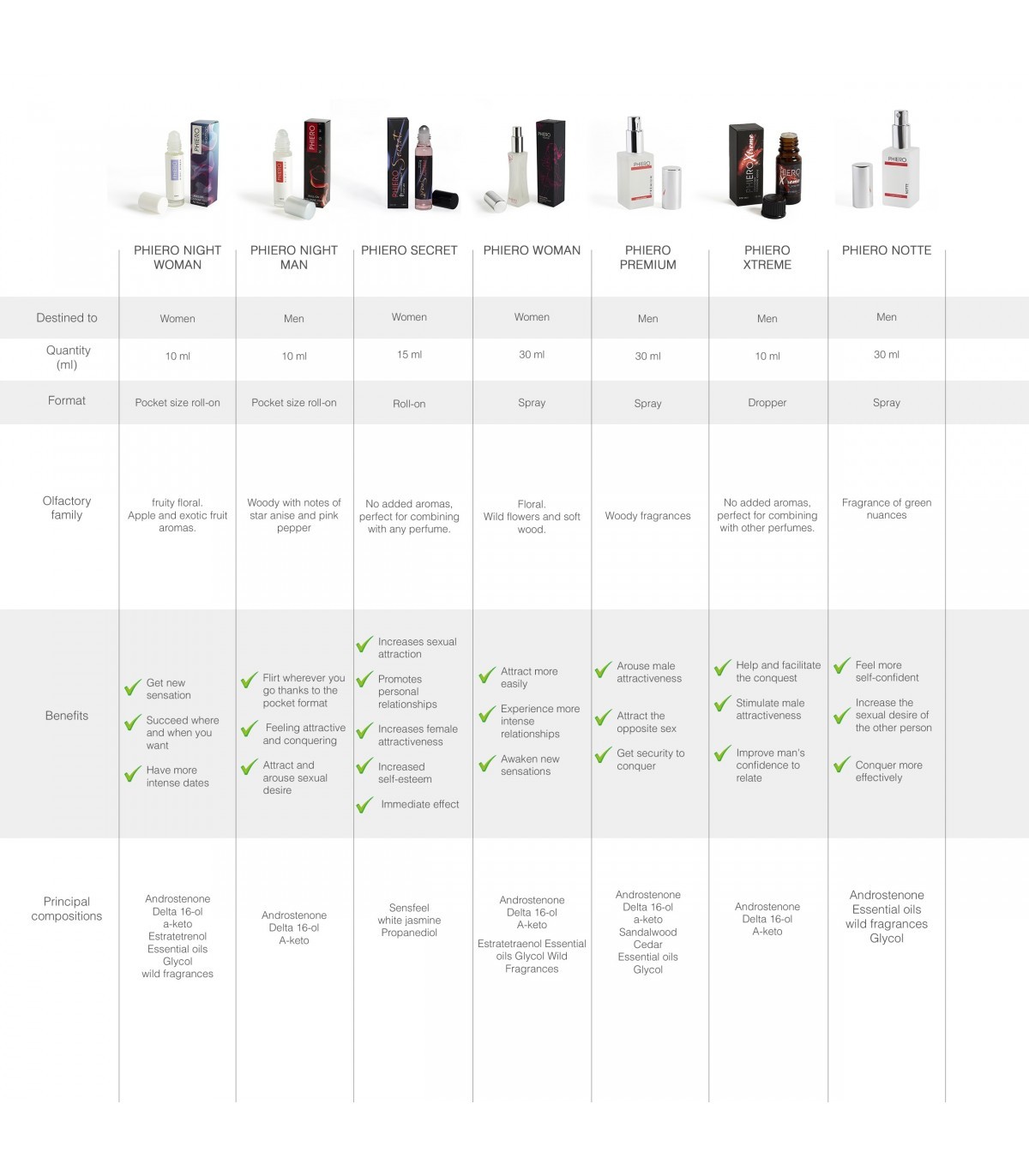Vengono percepiti attraverso le vie nasali, risvegliando l'olfatto quando entrano in contatto con l'organo vomeronasale, che invia un segnale all'ipotalamo, generando una risposta immediata. La sua formula è composta da 3 tipi di feromoni brevettati molto efficaci. I feromoni risvegliano l'attrattiva, migliorano le relazioni personali, aumentano la fiducia e migliorano la seduzione. Ha un aroma morbido e inebriante con tocchi legnosi che risvegliano l'interesse sessuale e aumentano la seduzione.