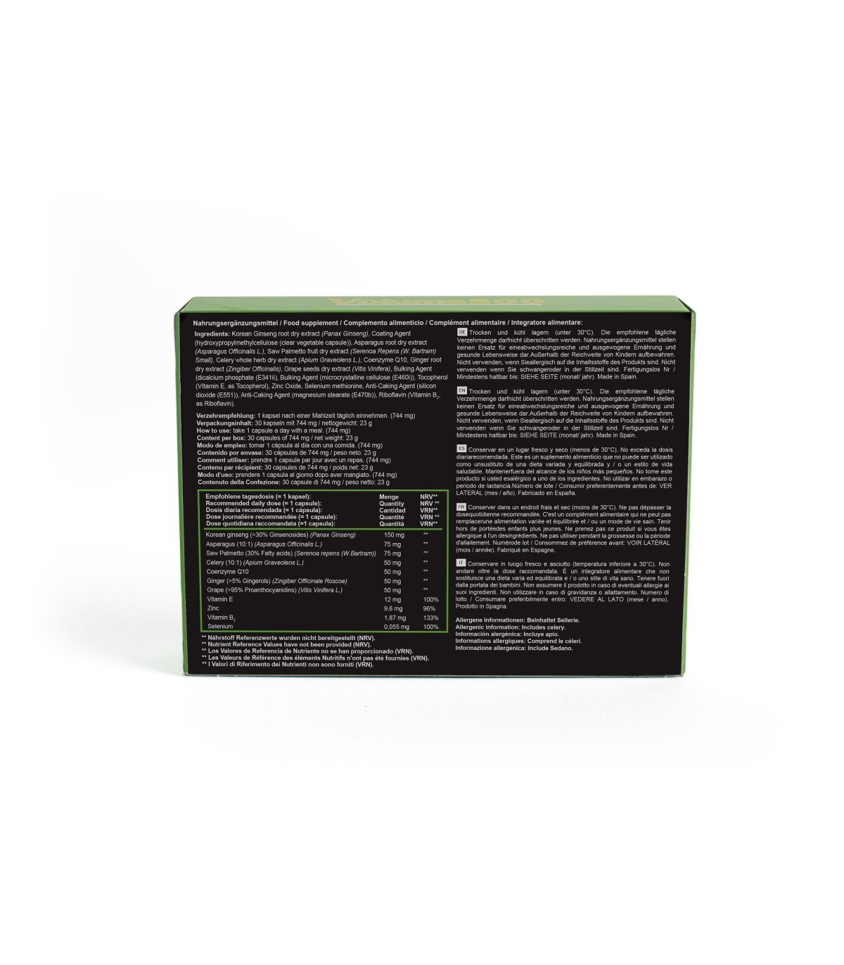 Ingredienti: Selenio, Coenzima Q10, Vitamina E o Tocoferolo, Vitamina B2 o Riboflavina, Zinco, Panax Ginseng, Serenoa Rapens, Zenzero, Vitis Vinifera, Estratto di Asparagi.