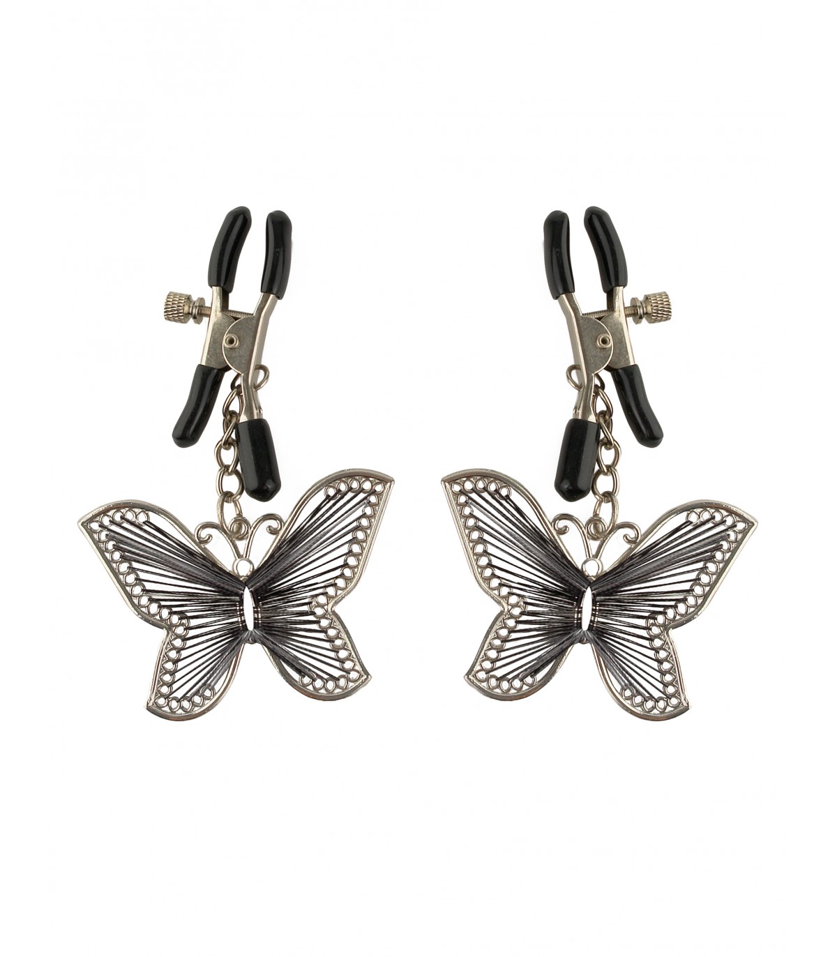 Realizzati con clip in metallo resistente e ricoperti da un morbido rivestimento in gomma, questi morsetti sono perfetti sia per i principianti che per gli appassionati di fetish. La quantità di pressione che applichi al capezzolo può essere regolata ruotando la vite, mentre le farfalle ti danno una stimolazione delicata ad ogni movimento.