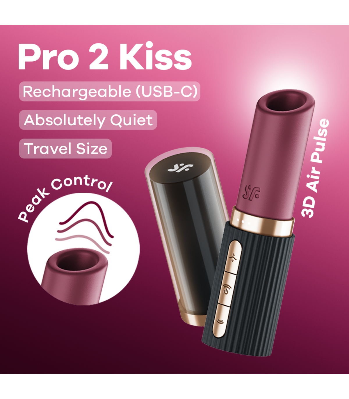 Scopri un bacio indimenticabile: Pro 2 Kiss combina un design discreto con la stimolazione delle onde di pressione senza contatto. Scegli un rossetto per poterlo portare discretamente in borsa.