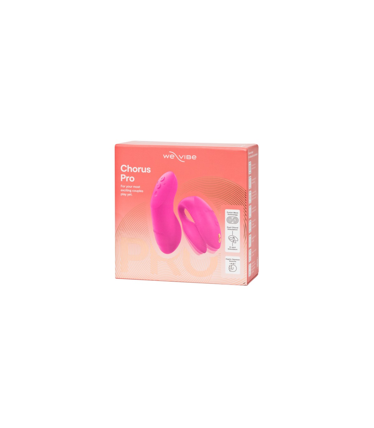 Chorus Pro è il vibratore per coppie più avanzato di We-Vibe, dotato di tecnologia Fusion Wave che offre sensazioni più profonde e potenti, e di comandi intuitivi sensibili al tocco e alla pressione per esperienze di piacere profondamente connesse.
