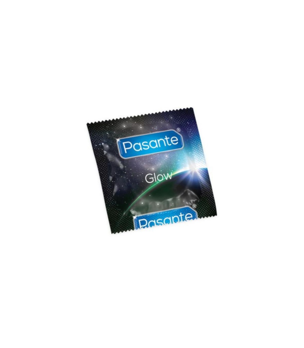 I preservativi Pasante Glow si illuminano al buio dopo essere stati esposti alla luce. Liscio, parallelo e con punte sui capezzoli.